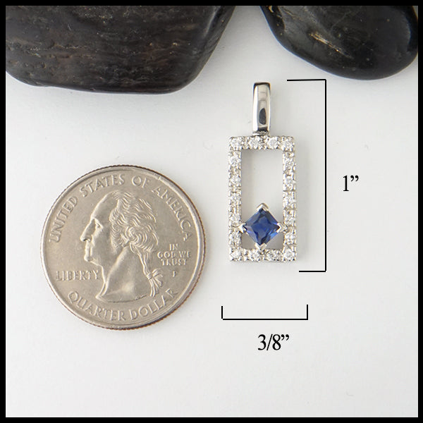 14K White Gold pendant set with 18 1.5mm diamonds, and a center 4.5x4.5mm Blue Sapphire.