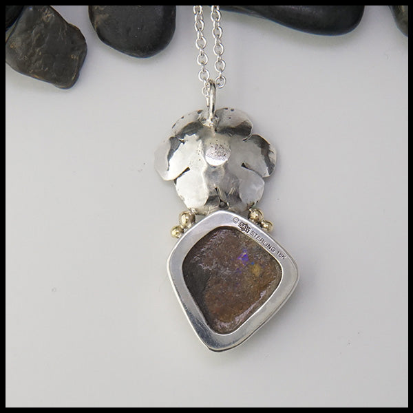 Custom pendant in Sterling Silver, 14K Rose and 18K Yellow Gold details. The center set stone is Australian Opalized Wood. Pendant comes with an 18" Cable Chain.