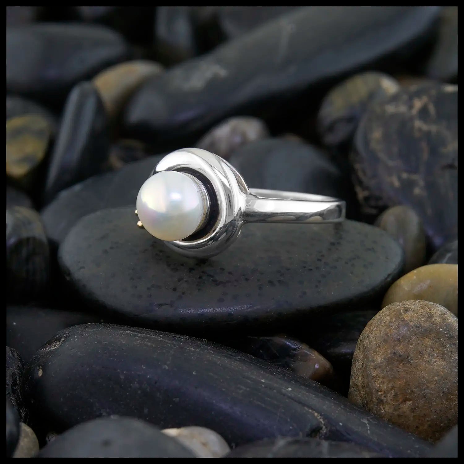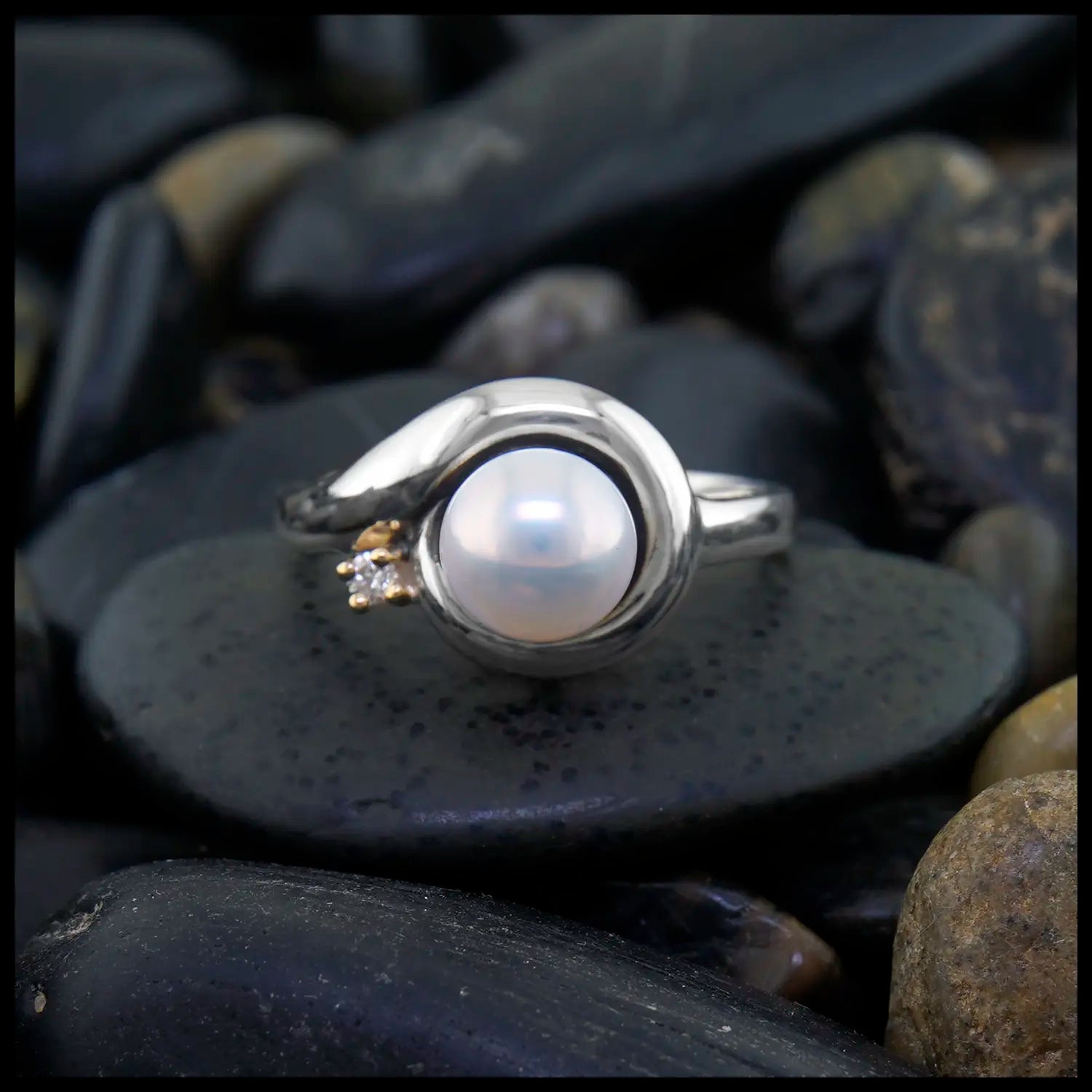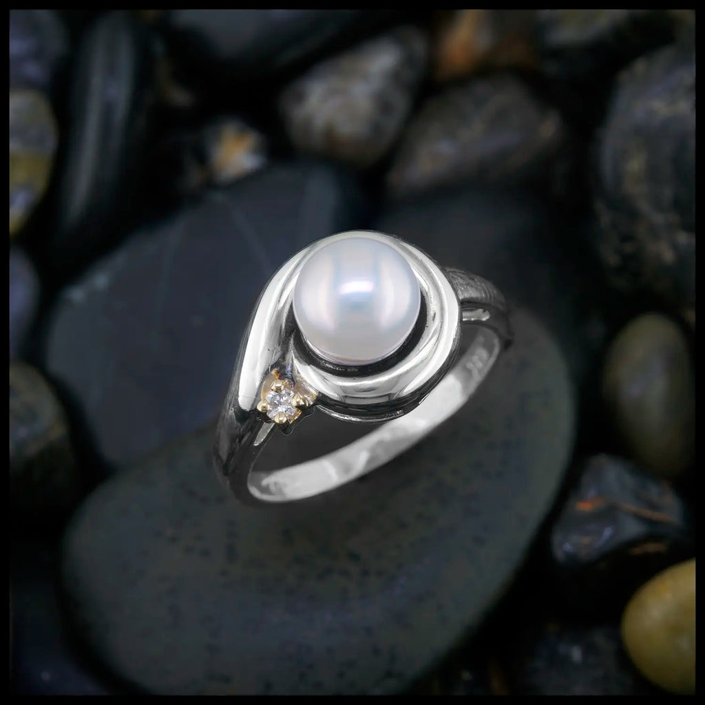 This ring features a fresh-water pearl set in a custom sterling silver frame accented by a diamond set in 14K yellow gold. This ring is a size 7 and can be resized upon request.