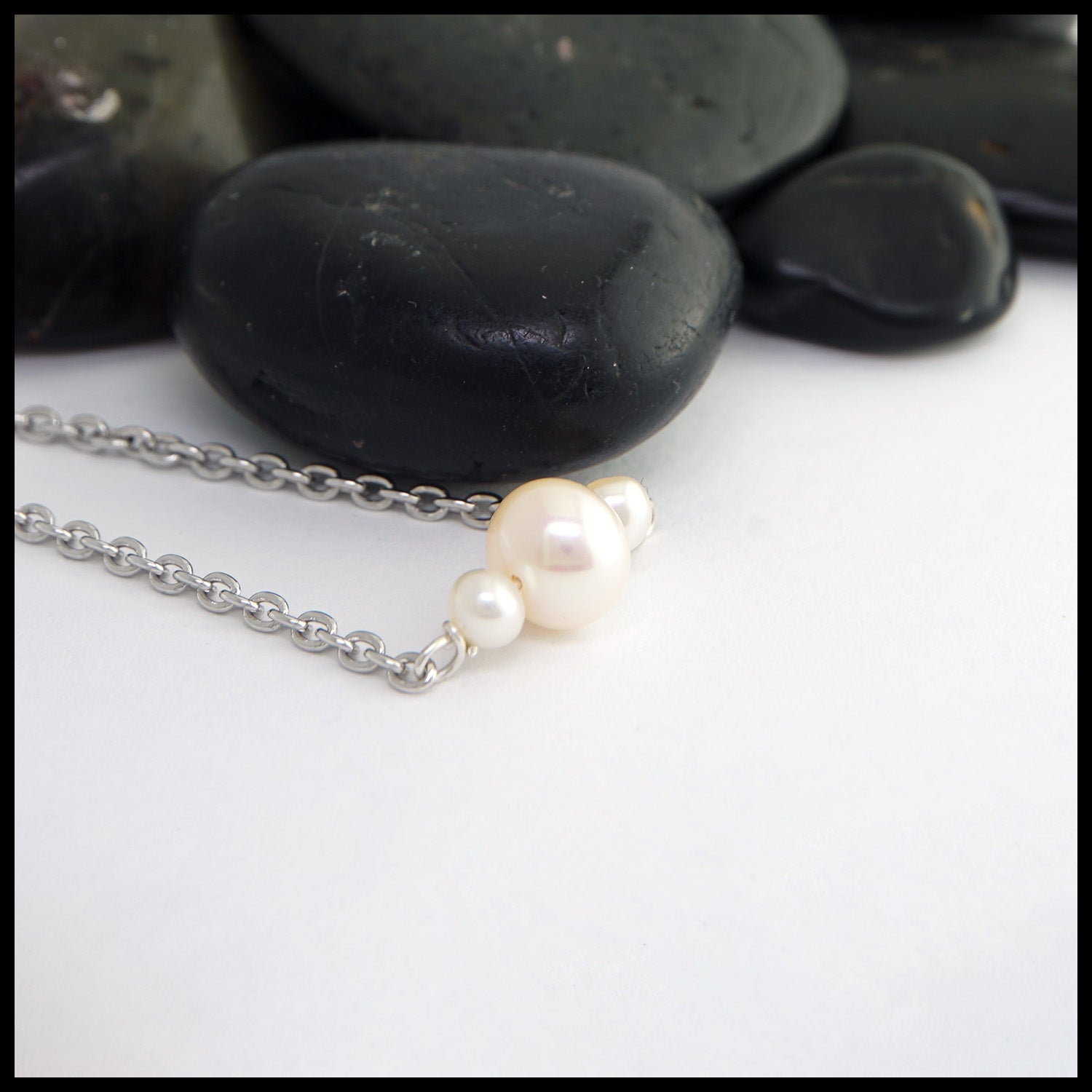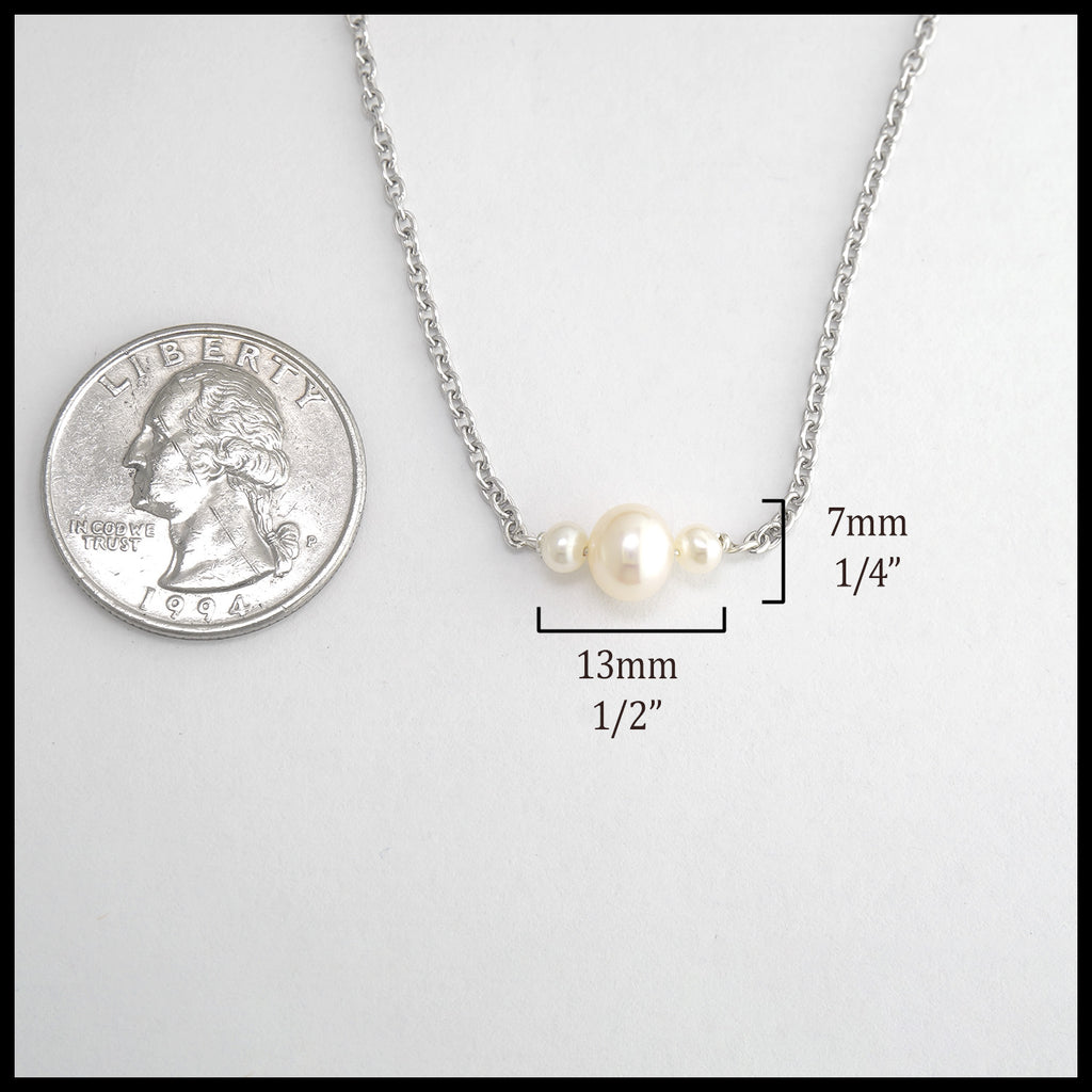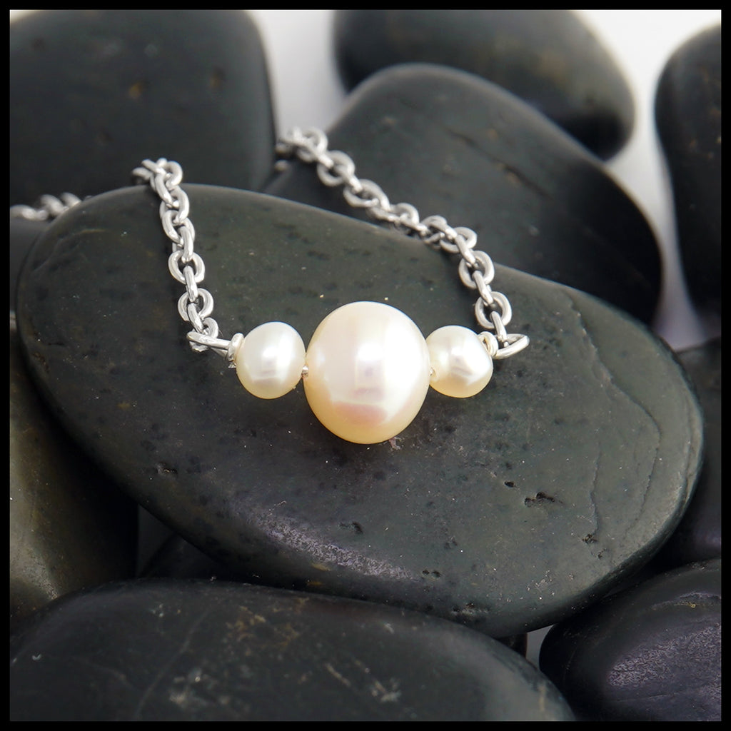 This stunning freshwater pearl pendant in sterling silver features three freshwater pearls, one large pearl and two smaller pearls on either side. This pendant comes on an attached 18" sterling silver cable chain.
