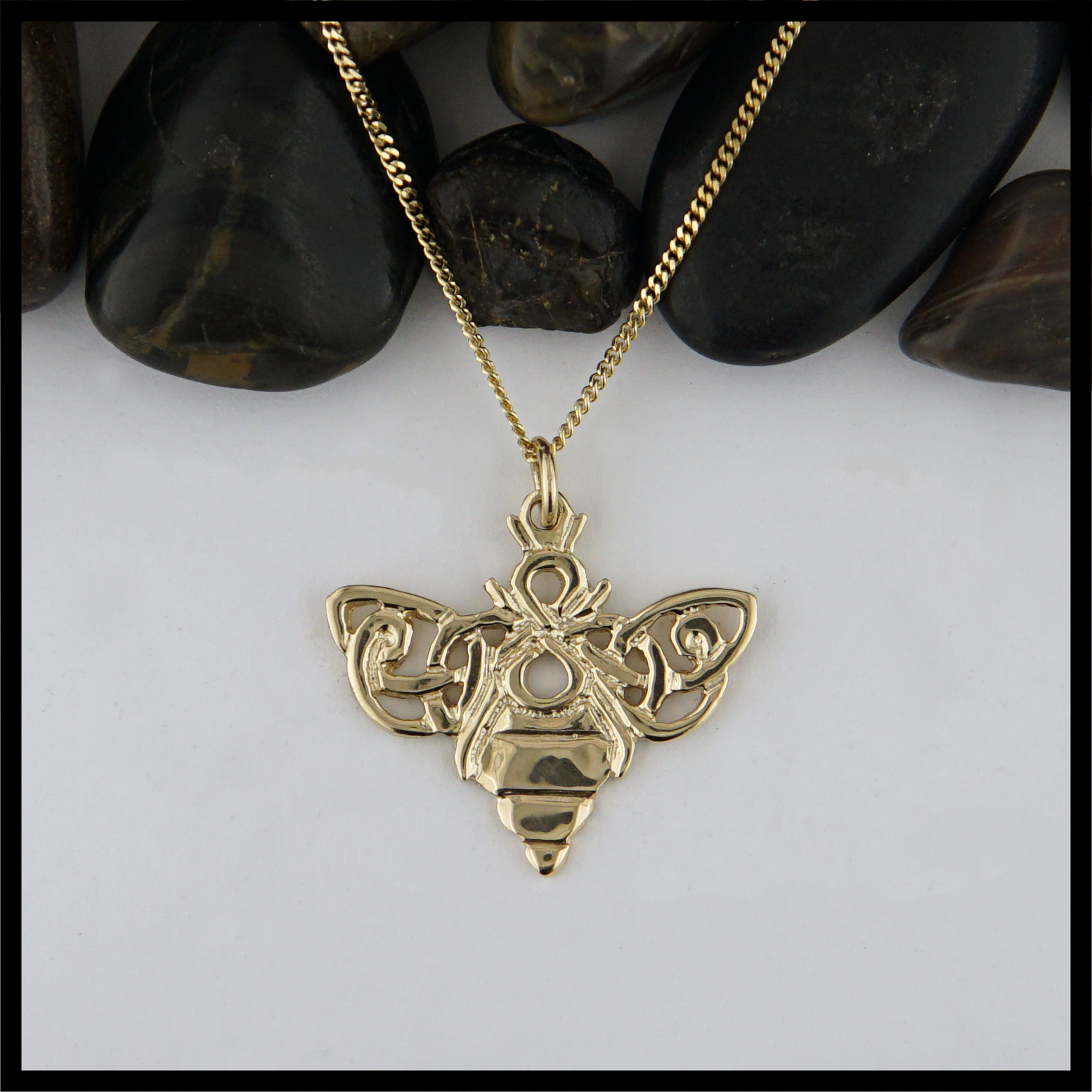 This 14K yellow gold Celtic Bee necklace by Walker Metalsmiths is inspired by traditional Celtic craft and folklore.