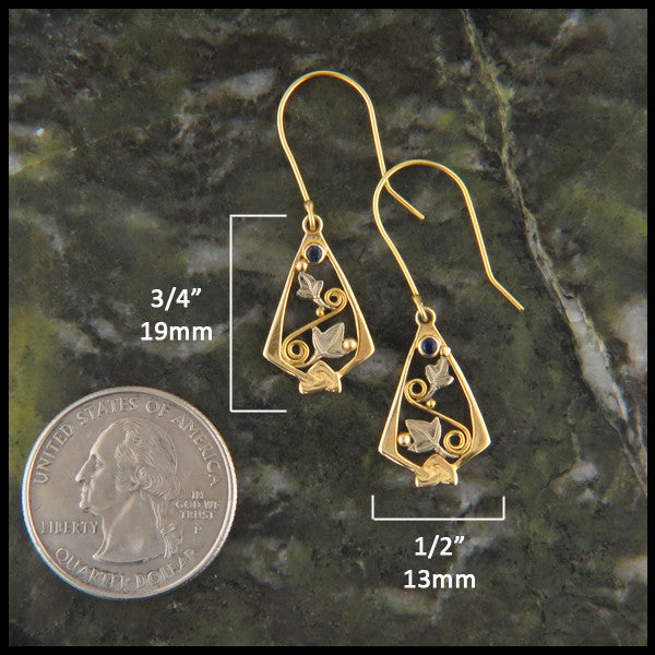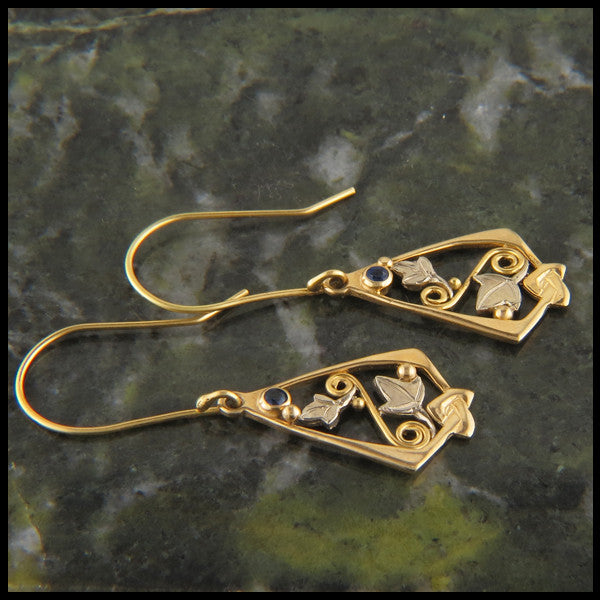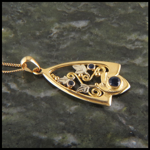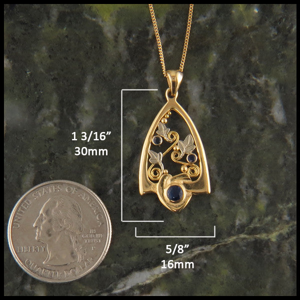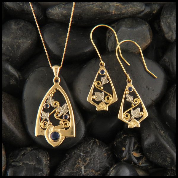 Unique Celtic Earring and Pendant set. 14K Yellow Gold frame with 18K Yellow gold filigree and 14K White Gold leaves. Set with a center 4mm Blue Sapphire and accent 2mm Blue Sapphires in the pendant and earrings.