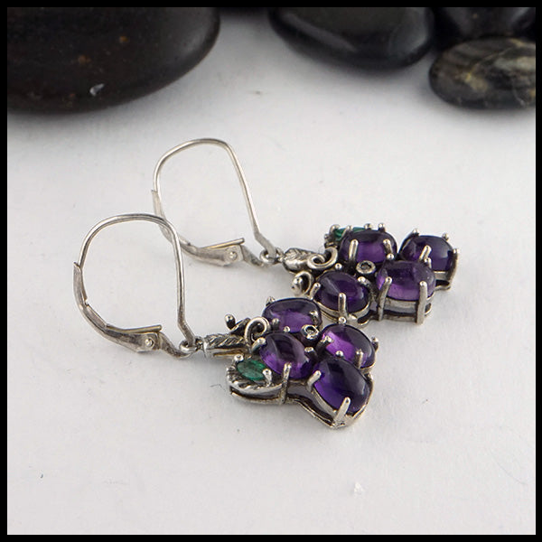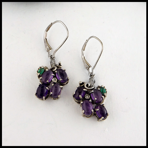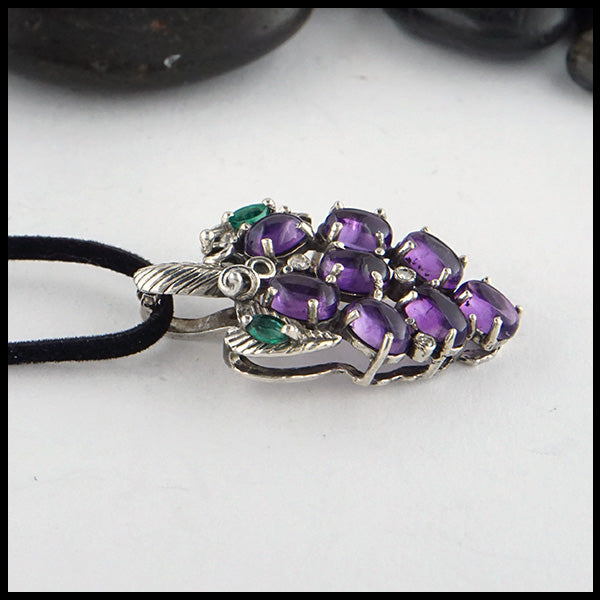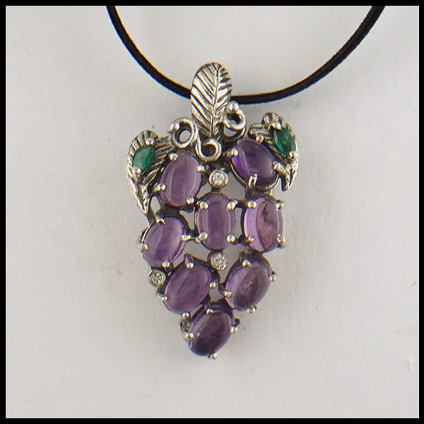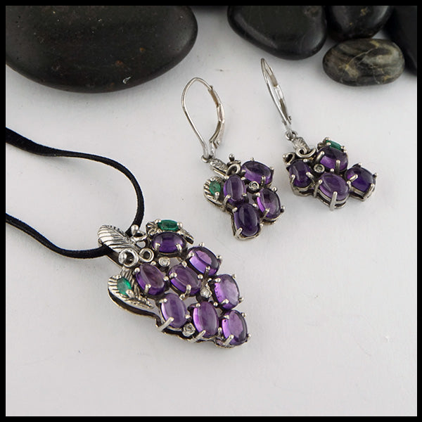 Pendant and Earring set in Sterling Silver. Set with Amethyst cabochons, marquise Emeralds, and Diamond Accents. Pendant comes on a velvet cord.