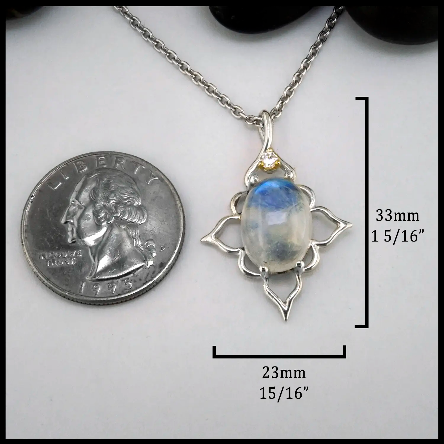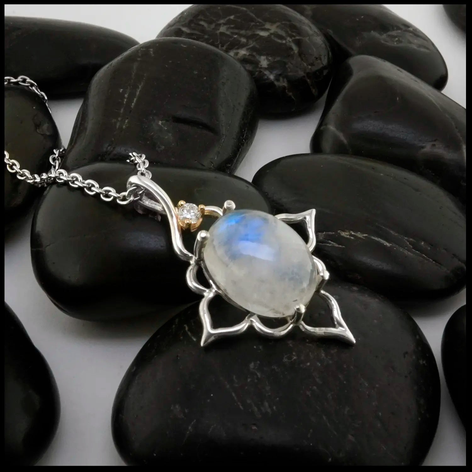 This stunning pendant features a lustrous Moonstone set in Sterling Silver. Set at the apex of the Moonstone is a 2mm Diamond, prong set in 14K Yellow Gold. Created by craftsman Tom Carter, this pendant comes on an 18" Chain.