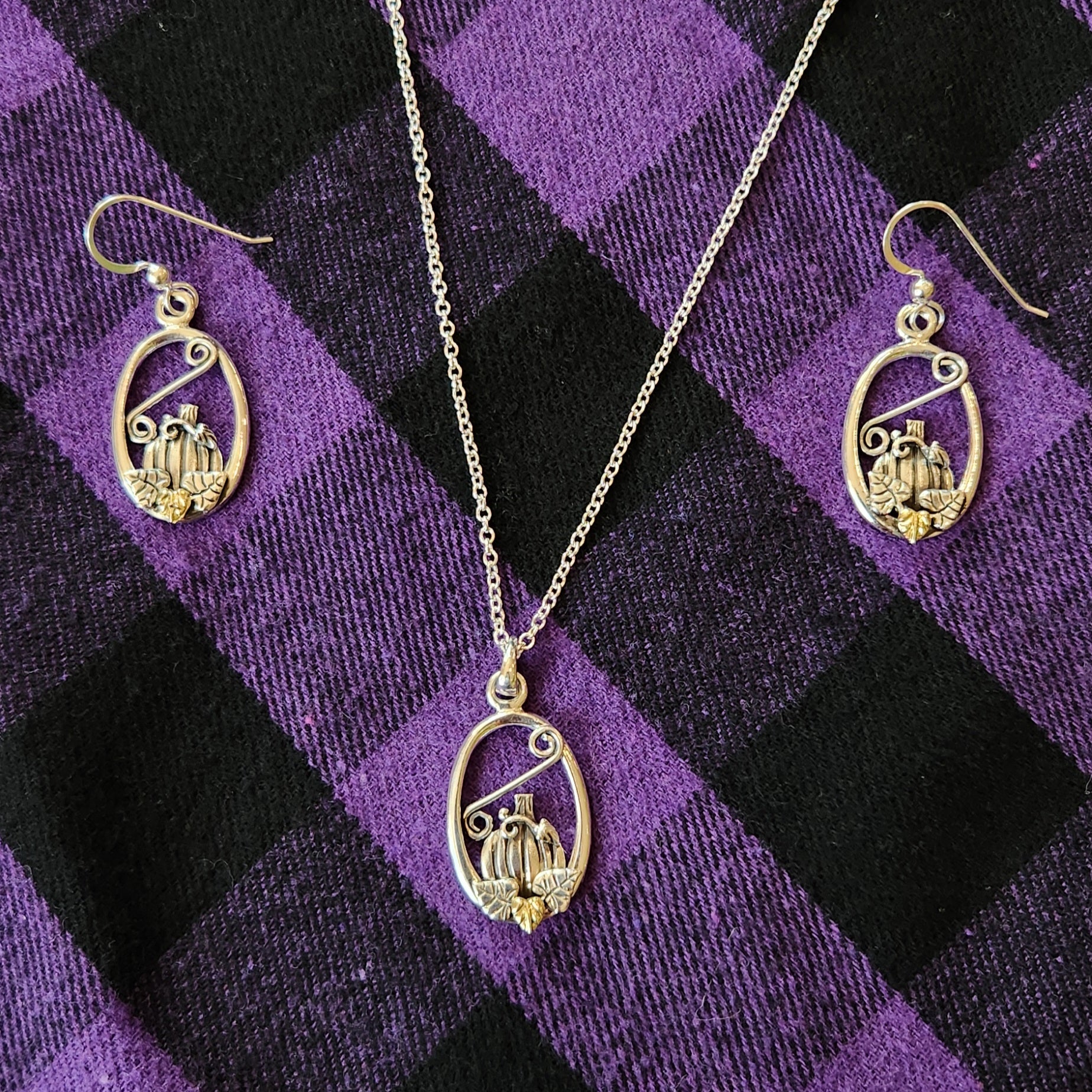 We picked the perfect pumpkins from the patch and framed them in Sterling Silver, just for you! Evoking memories of crisp Fall days, this set makes for a cozy Autumn accent. Featuring Sterling Silver leaves and spirals, this set also hold the last sun-warmed leaves of the season in 18K Gold. Created by our craftsman, Nicole; this set comes with an 18" Cable Chain.
