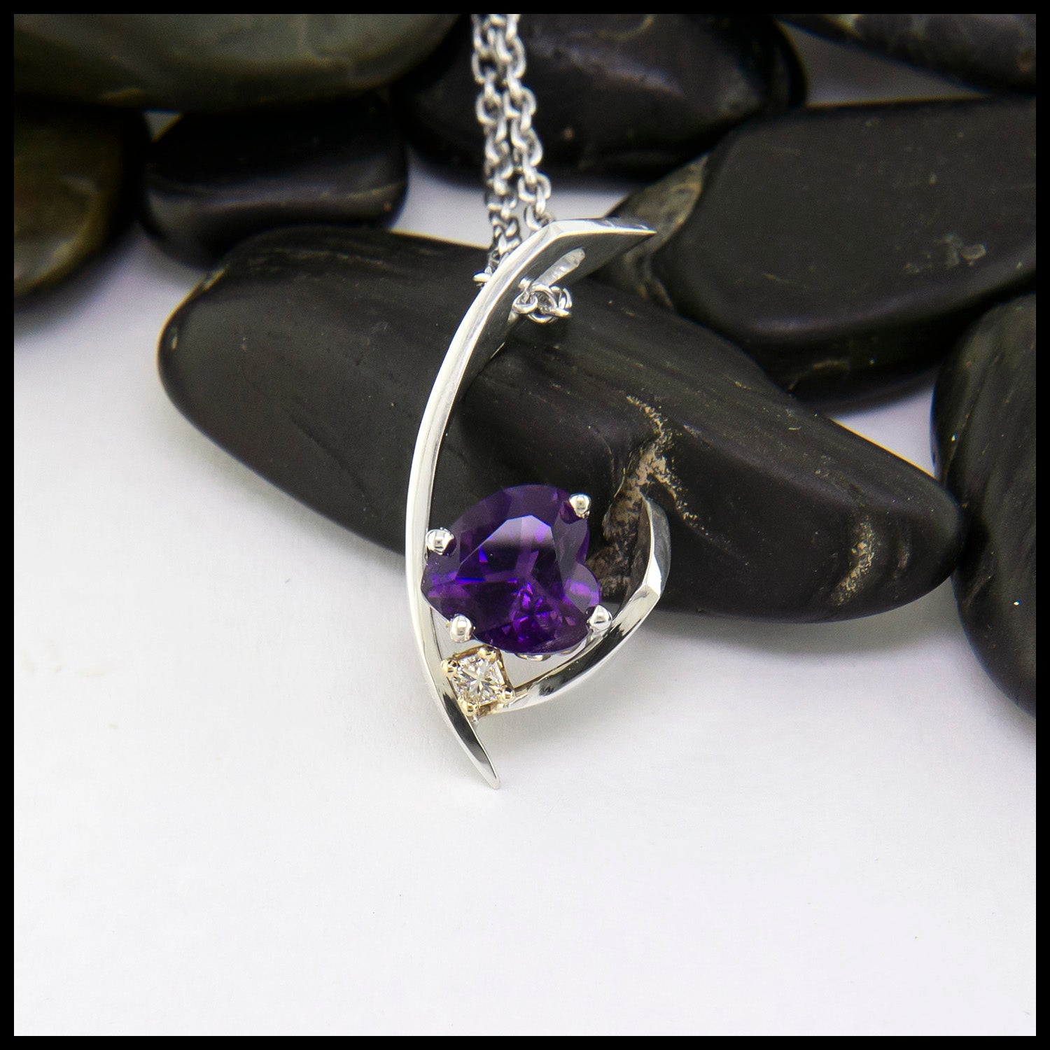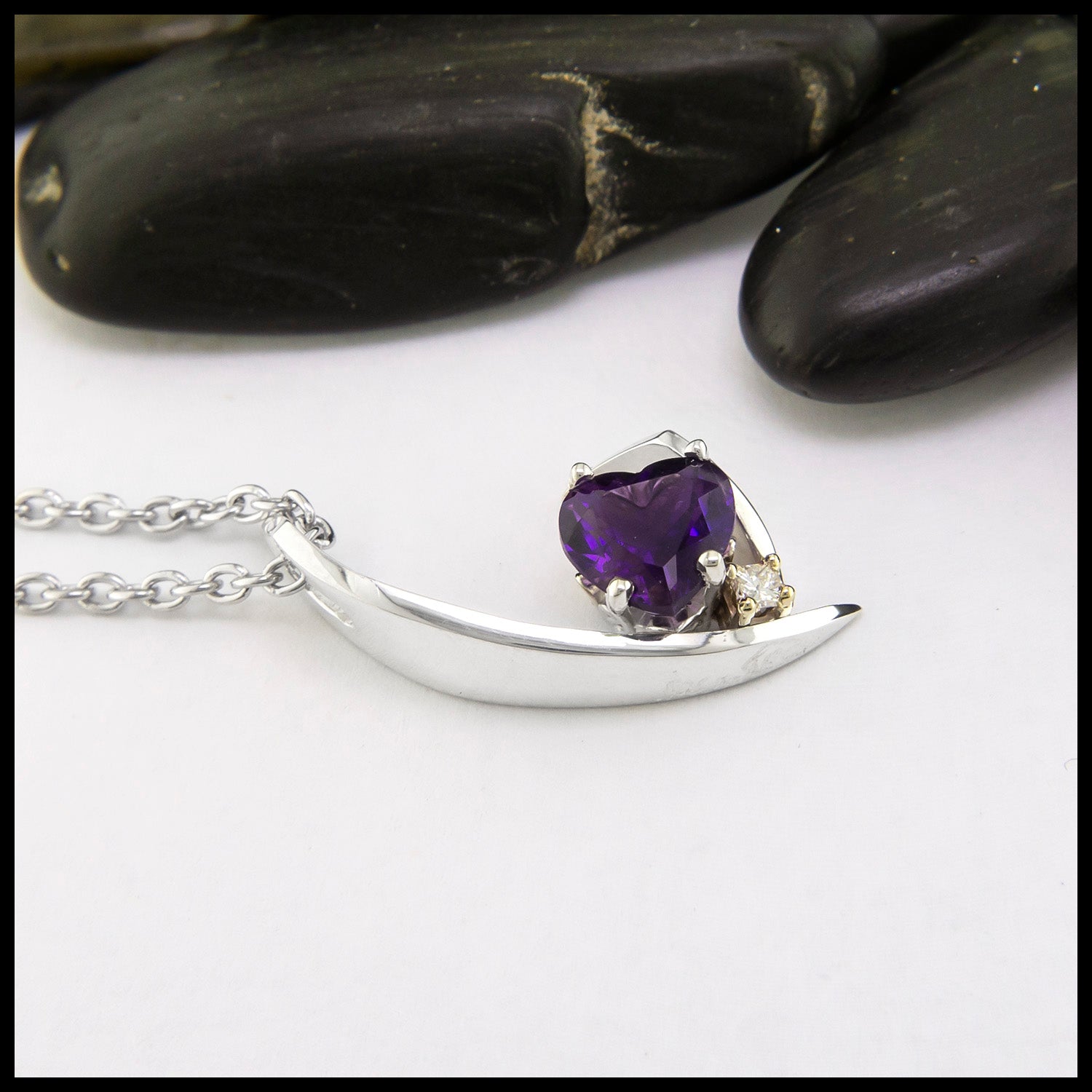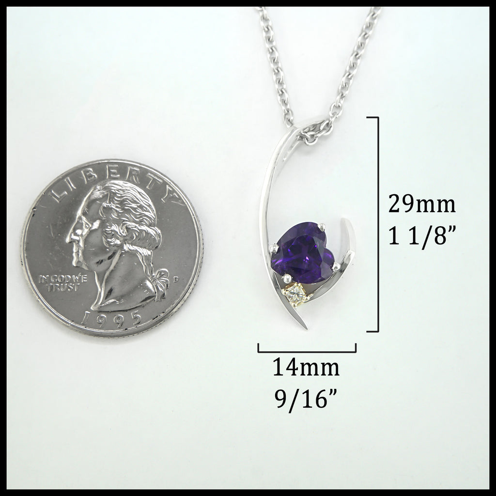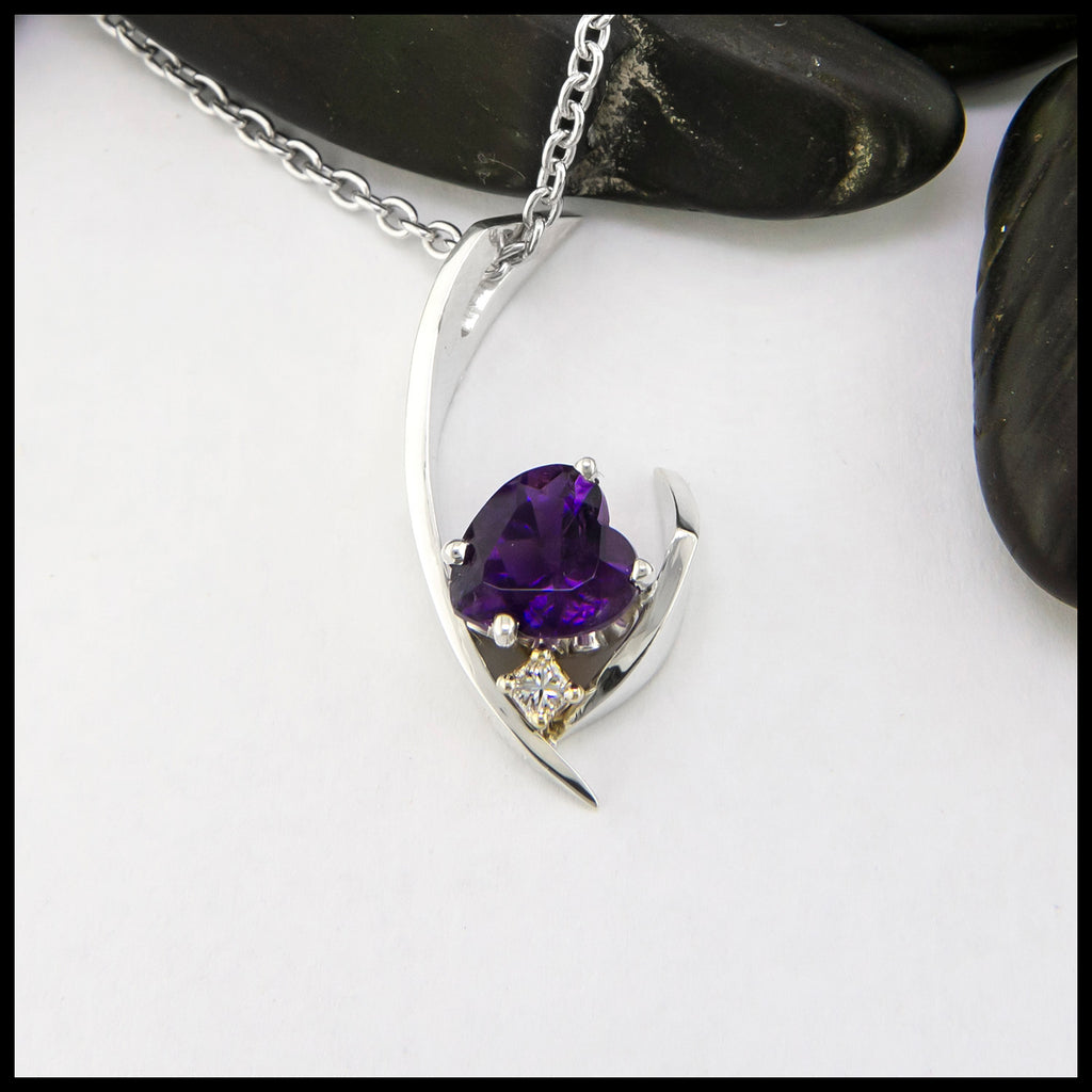 This sterling silver pendant features a heart-shaped amethyst centerpiece and a dazzling princess cut diamond accent set in 14K yellow gold. It also includes an 18" cable chain. Show your love with this elegant, classic piece.