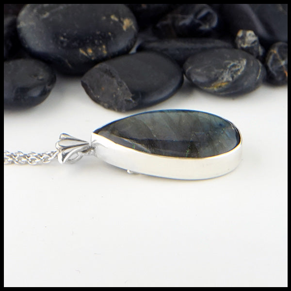 Custom Sterling Silver pendant set with a center pear shaped Labradorite, with a hand-crafter cattail design on the back. Pendant comes with an 18" Cable Chain.