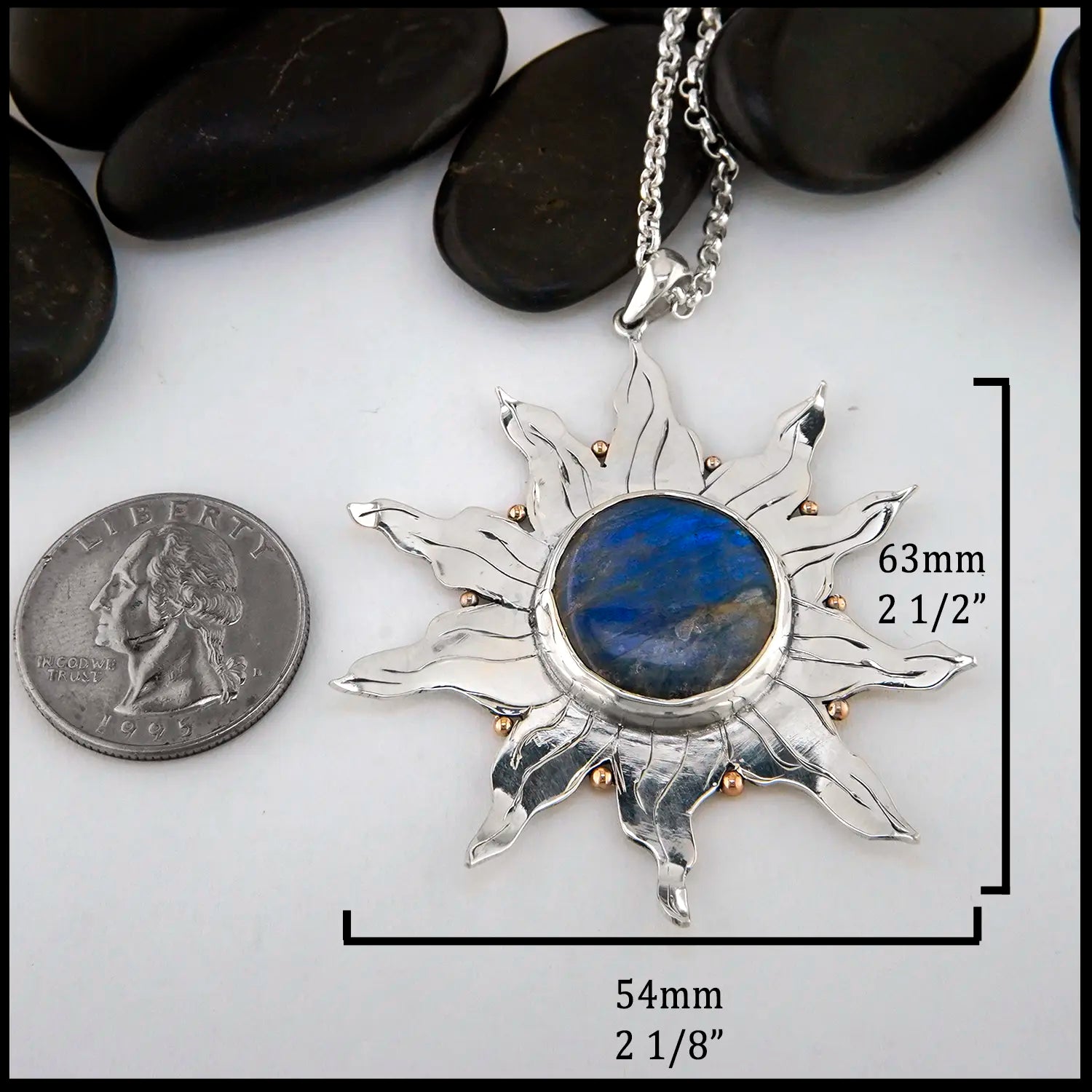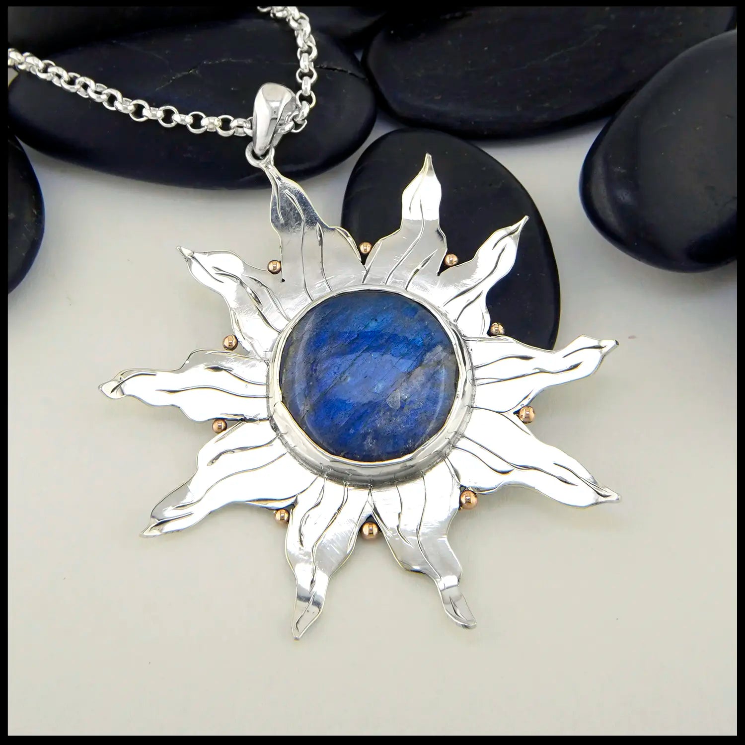 Set in Sterling Silver, this Custom Labradorite Sunburst pendant shines brilliantly! Accented by 14K Rose beading details. Created by our craftsman Nicole, This pendant comes on an 18" Rolo Chain.
