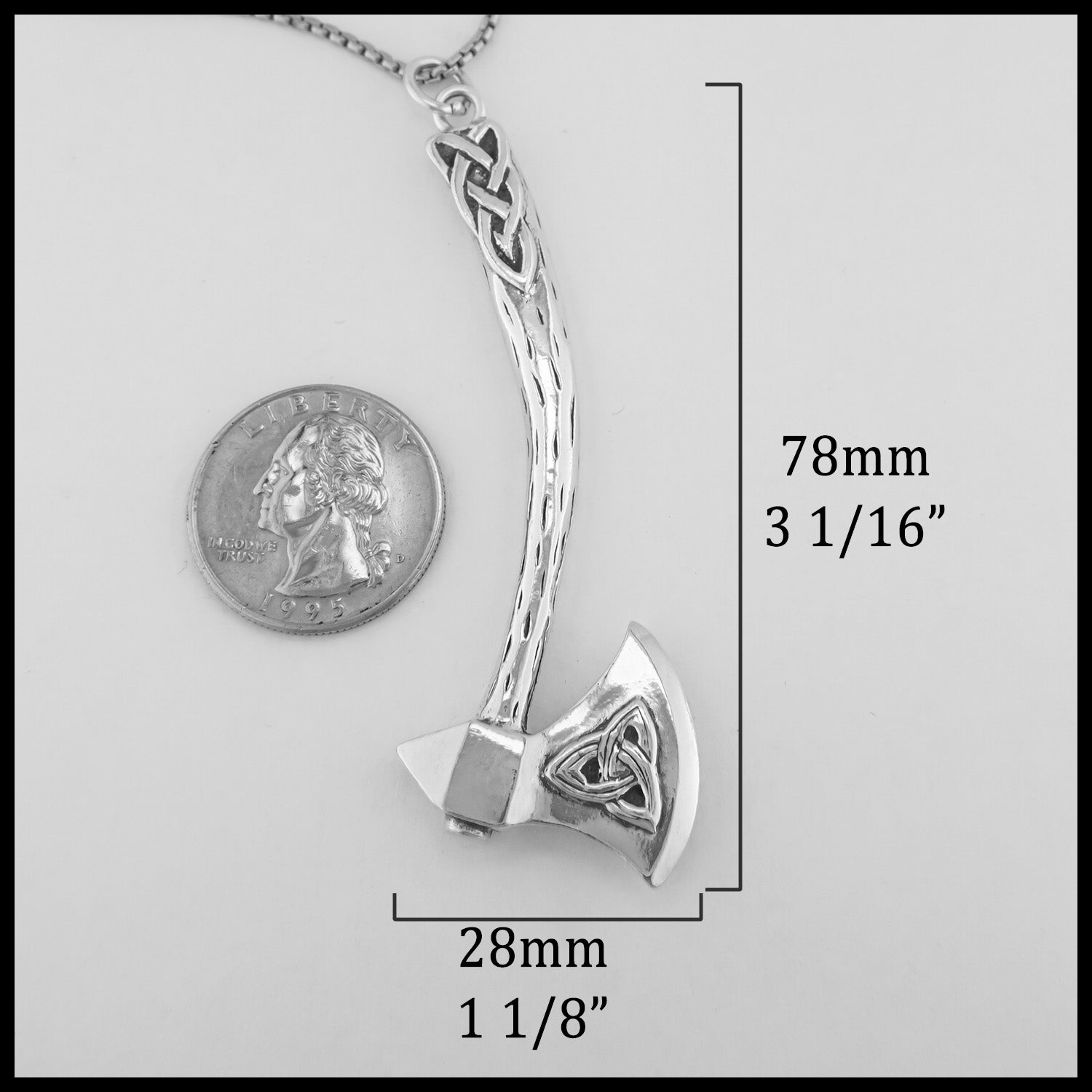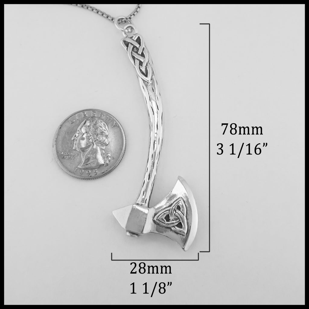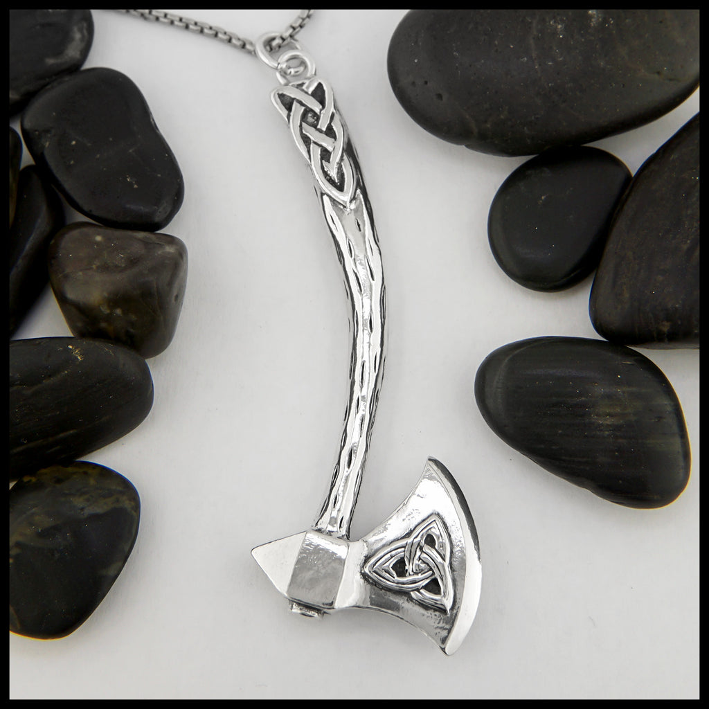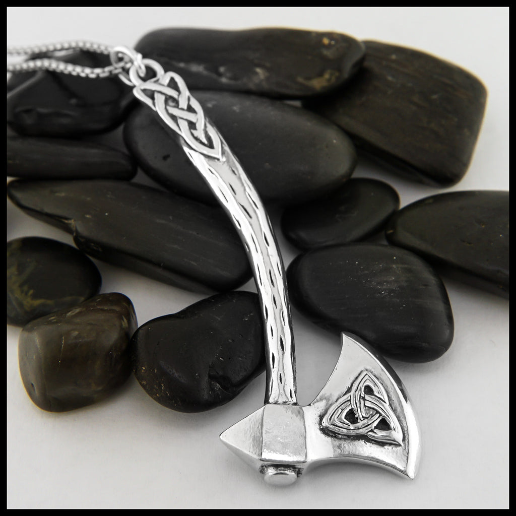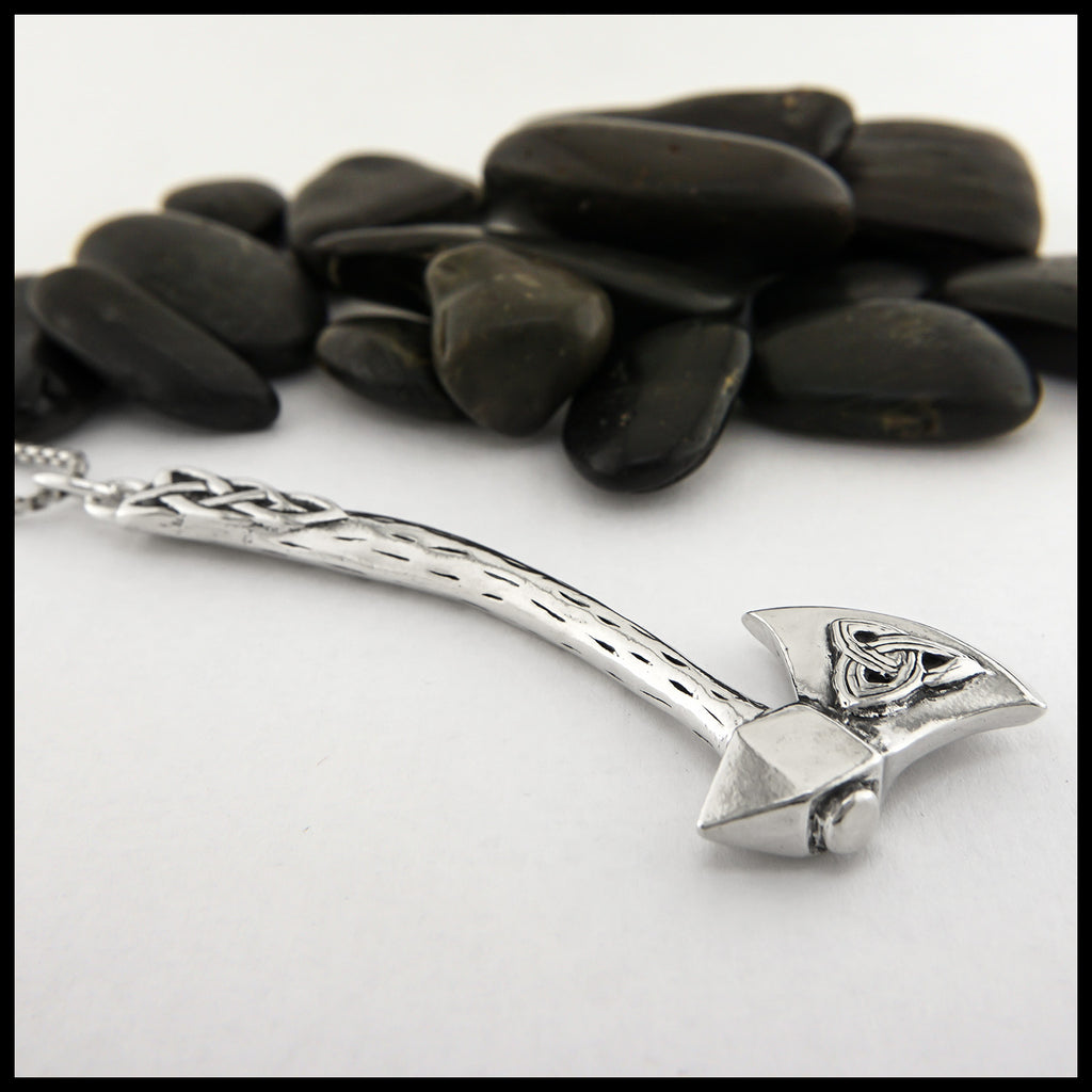 The Large Celtic Axe Pendant features a trinity knot on the blade with knotwork in the rustic wood textured axe handle. This pendant is sterling silver.