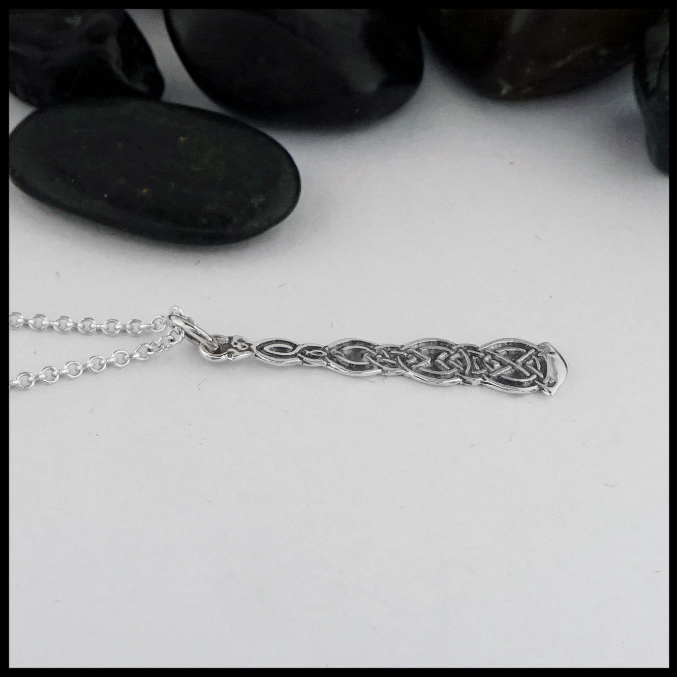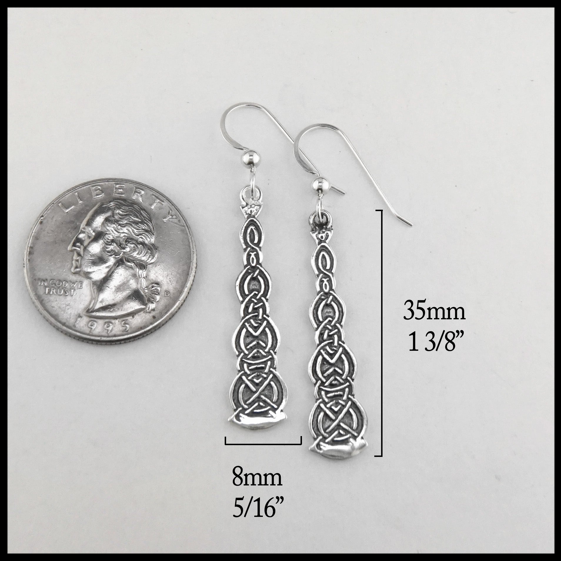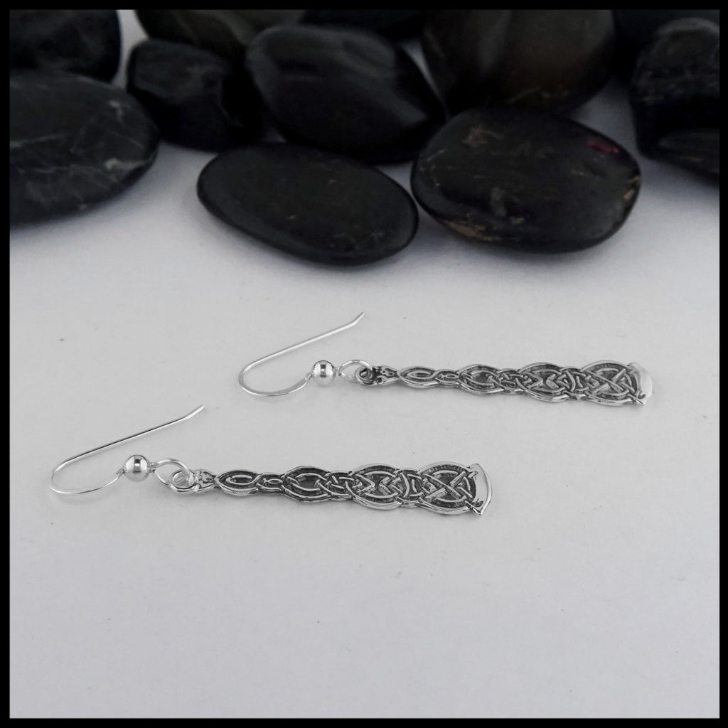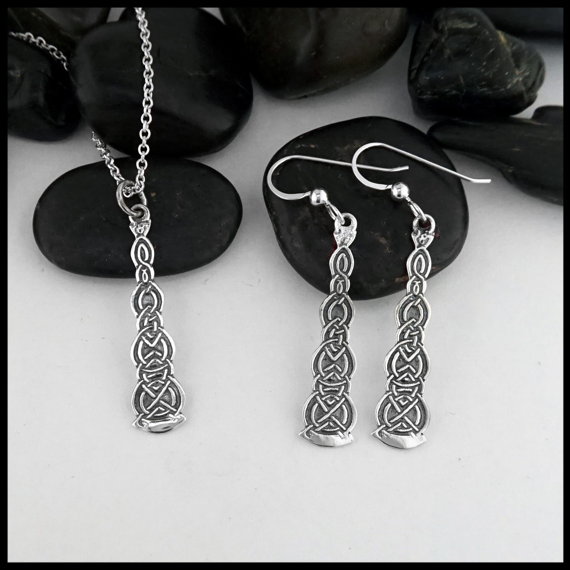 Sterling Silver elongated pendant and earring set with Celtic knotwork designs. Pendant comes on an 18" Sterling Silver Cable Chain.