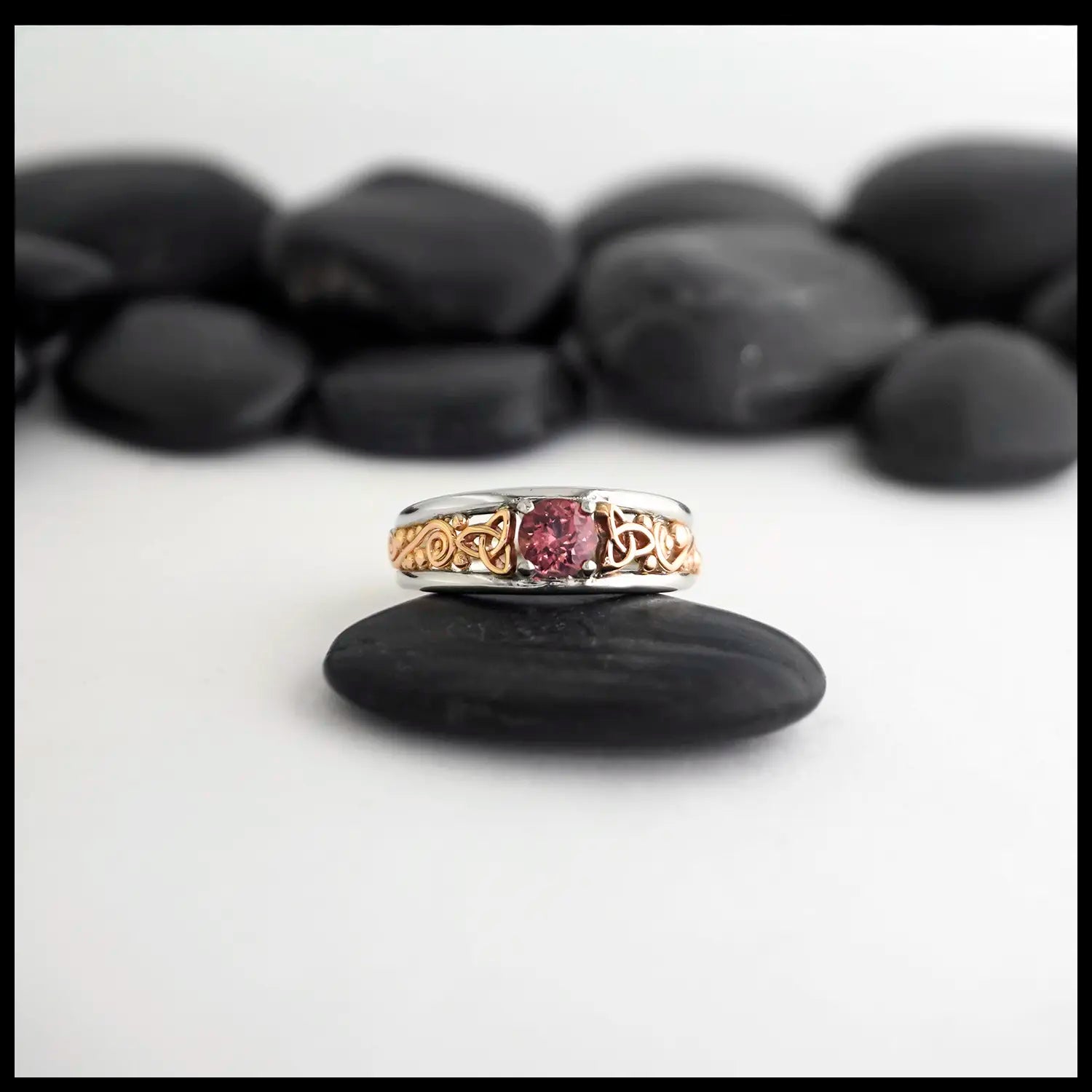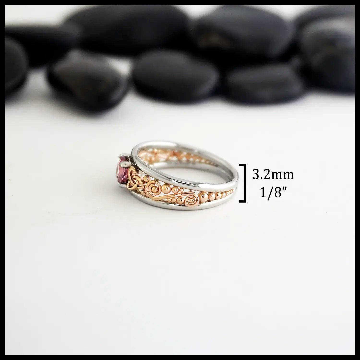This gorgeous 5mm Malaya Garnet is set in a custom band cast in 14K White Gold. Accenting the gorgeous tones of pink, the Trinity knots, beading, and spiral flourishes are cast in 14K Rose Gold. This ring is currently a size 7 1/2 and may be resized on request. This the first frame ring created by our craftsman Nicole!