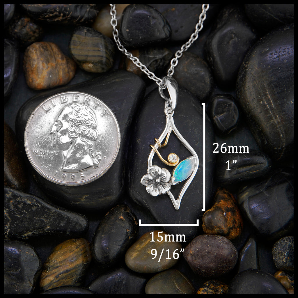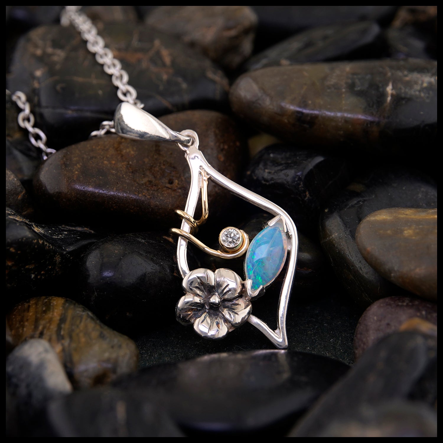 This custom pendant features a marquise opal centerpiece accented by a diamond bezel set in 14k yellow gold. These stones are set in a custom sterling silver frame that is decorated with a sterling silver flower and 14k yellow gold wire details. This pendant comes with an 18" cable chain.