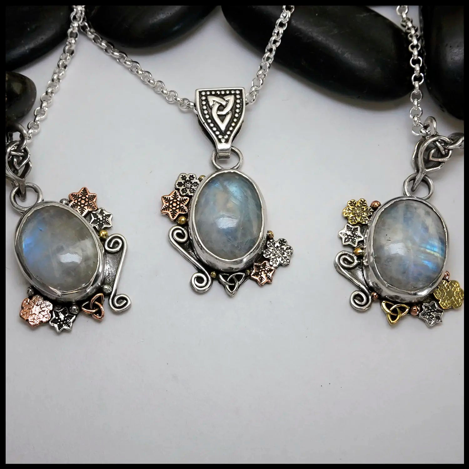 Bezel Set in custom Sterling Silver settings, these gorgeous pendants each feature their own unique Moonstones! Accented with 14K Rose gold and 18K Yellow Gold details, these pendants were crafted by our craftsman's apprentice, Dominic! Each pendant comes on an 18" Rolo Chain.