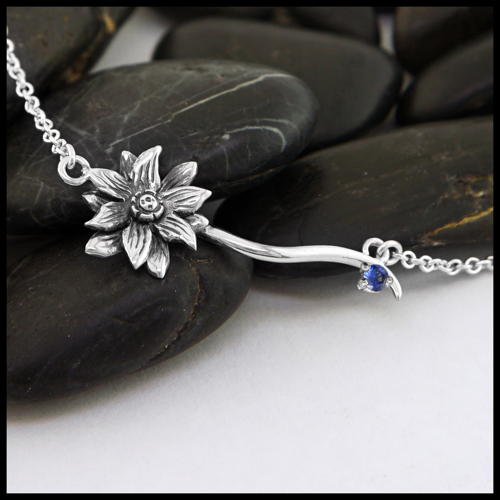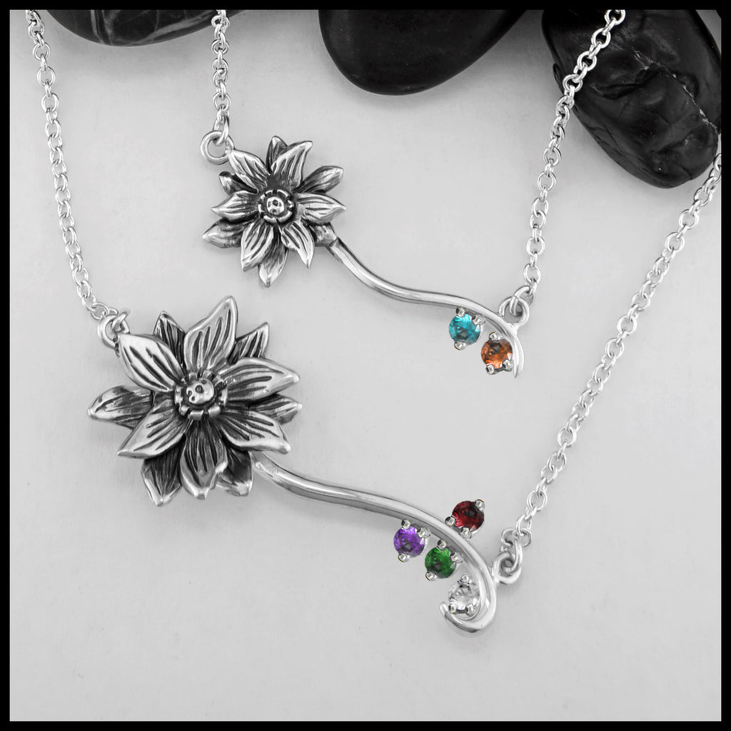 In many different cultures, the lotus flower traditionally symbolizes strength, resilience, purity, and rebirth. As lotuses rise from the mud without stains, they are often viewed as a symbol of purity; since they return to the murky water each evening and open their blooms at the break of day. This Sterling Silver Mother's Lotus Pendant is the perfect representation of this beautiful and transcendent bloom. This pendant is available in both a large and small version and comes with a 16" attached cable chain. These pendants are available with 1 to 6 simulated birthstones for the small pendant and 1 to 9 simulated birthstones for the large pendant.