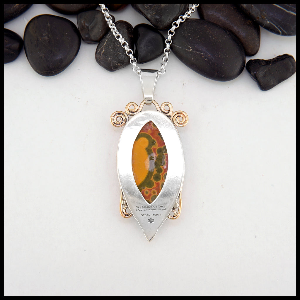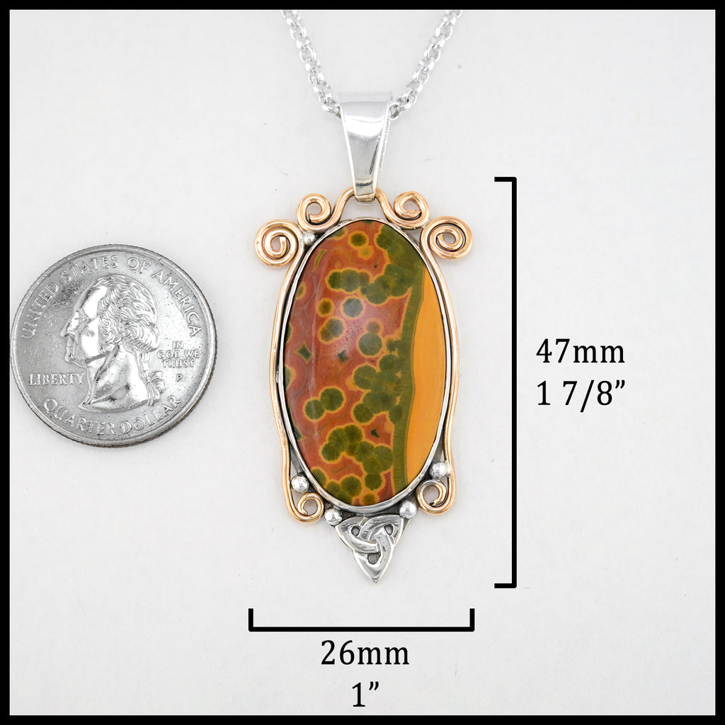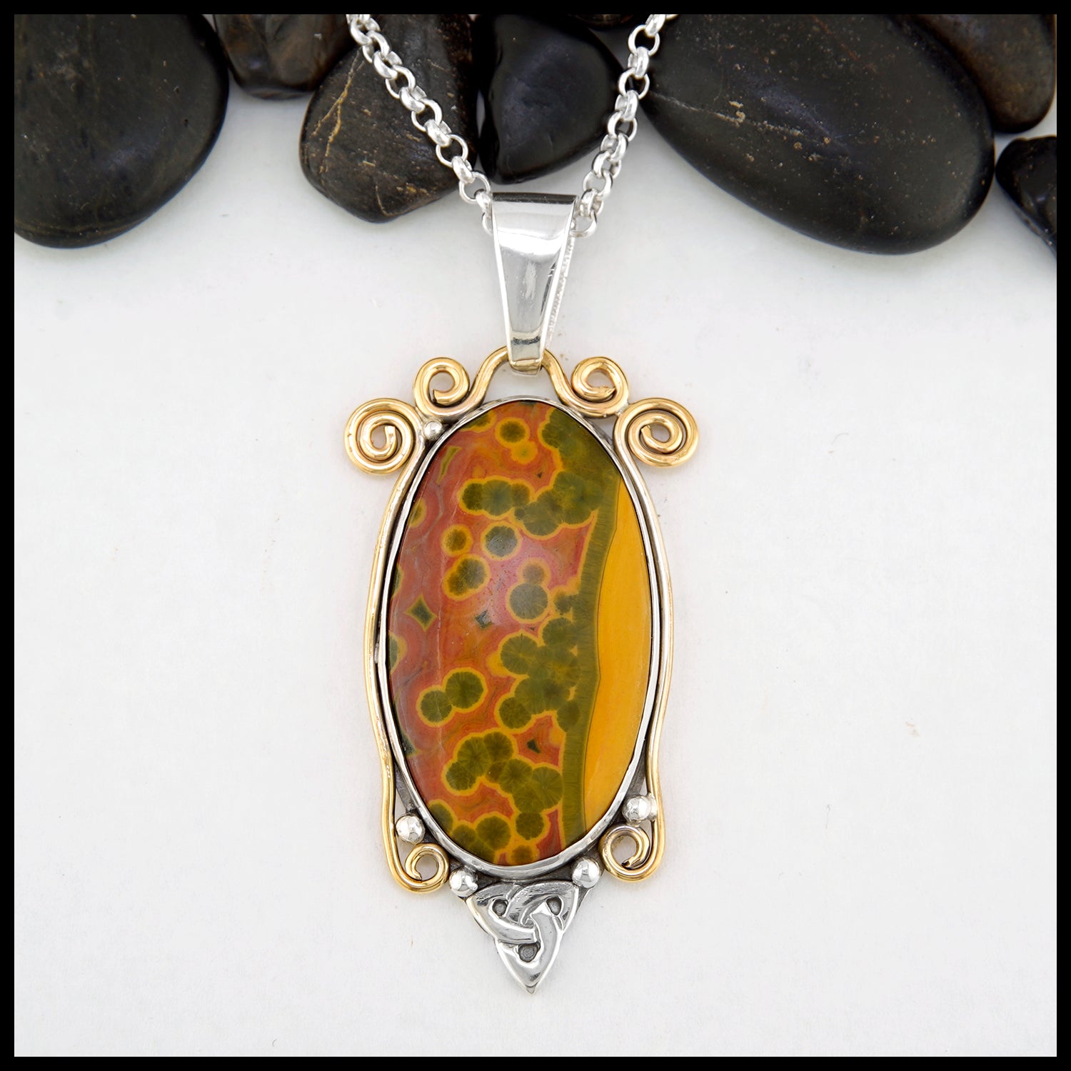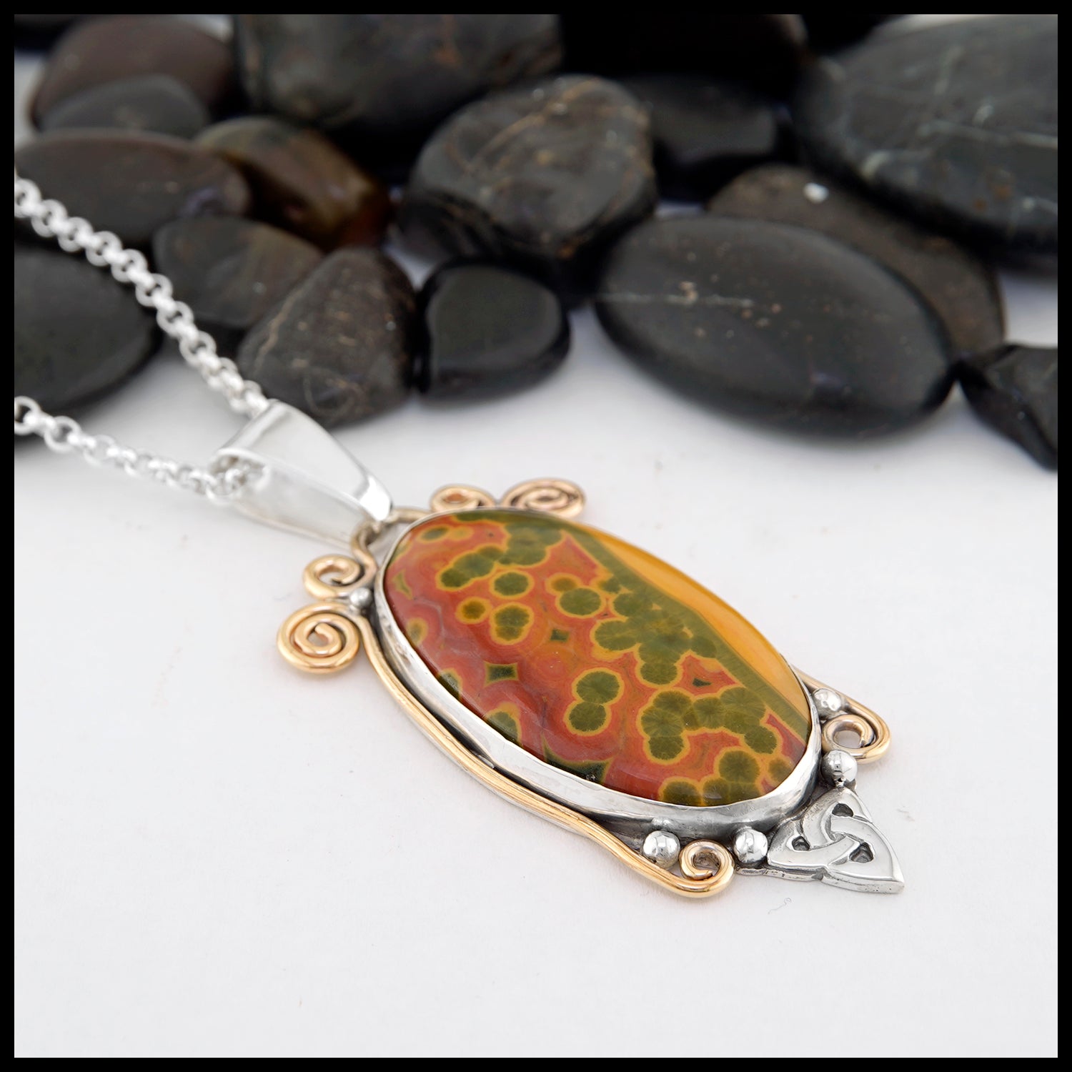 This custom sterling silver pendant showcases an Ocean Jasper decorated with a Celtic trinity knot in sterling silver and 14K yellow gold-filled wire details. This pendant comes with an 18" Medium Rolo.