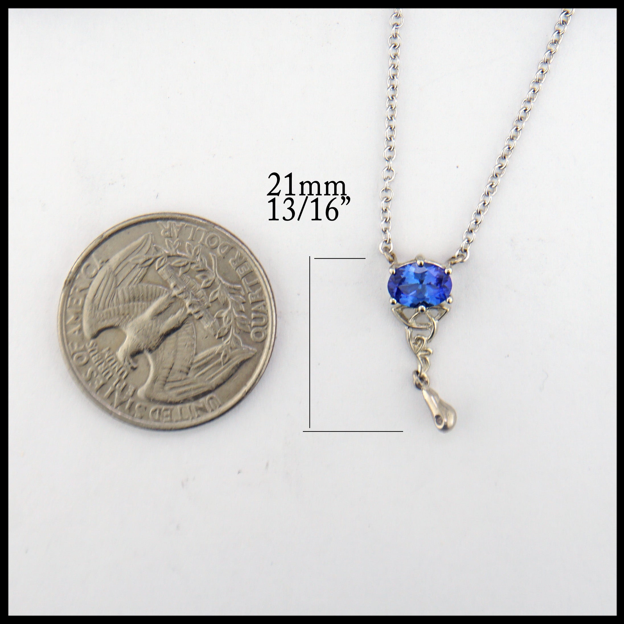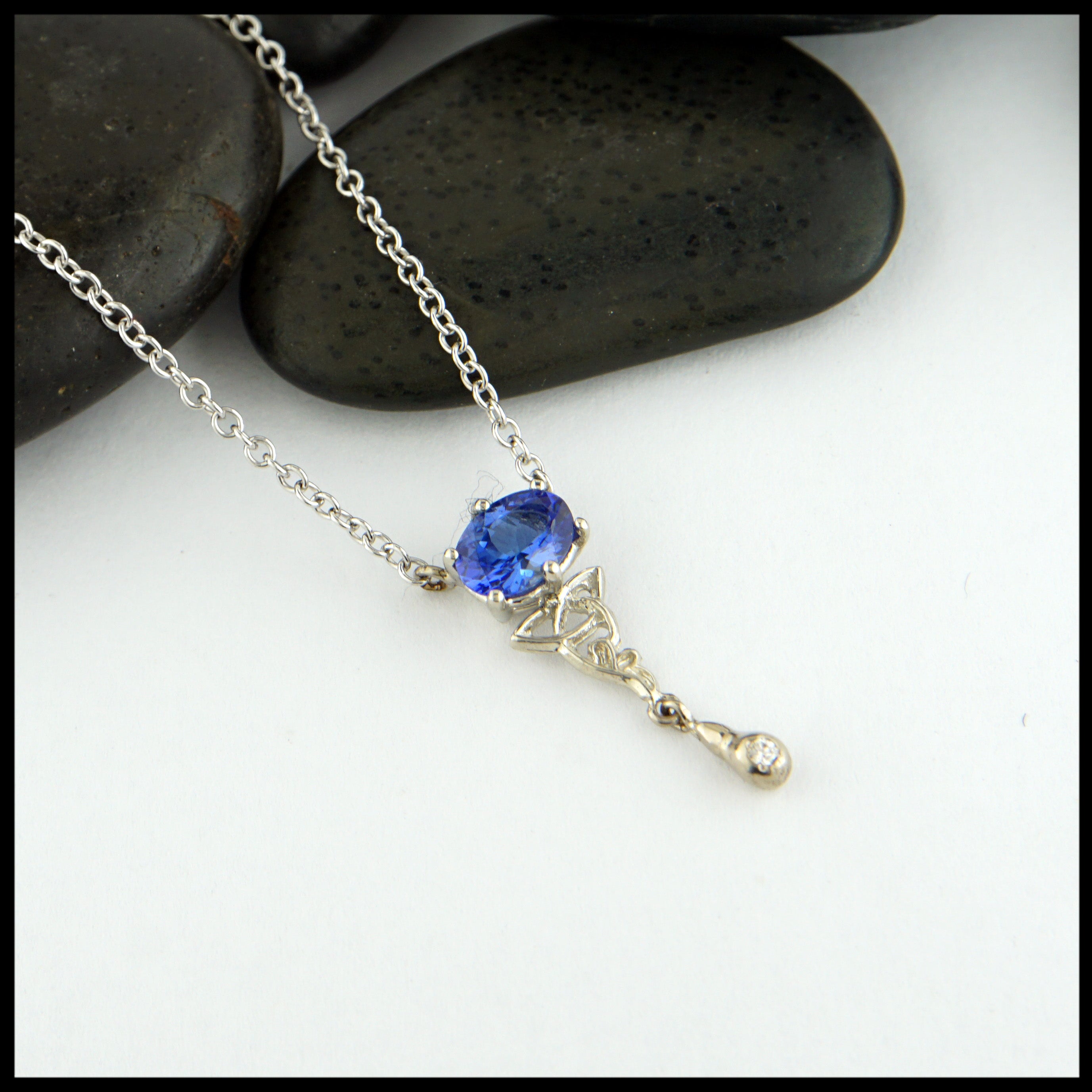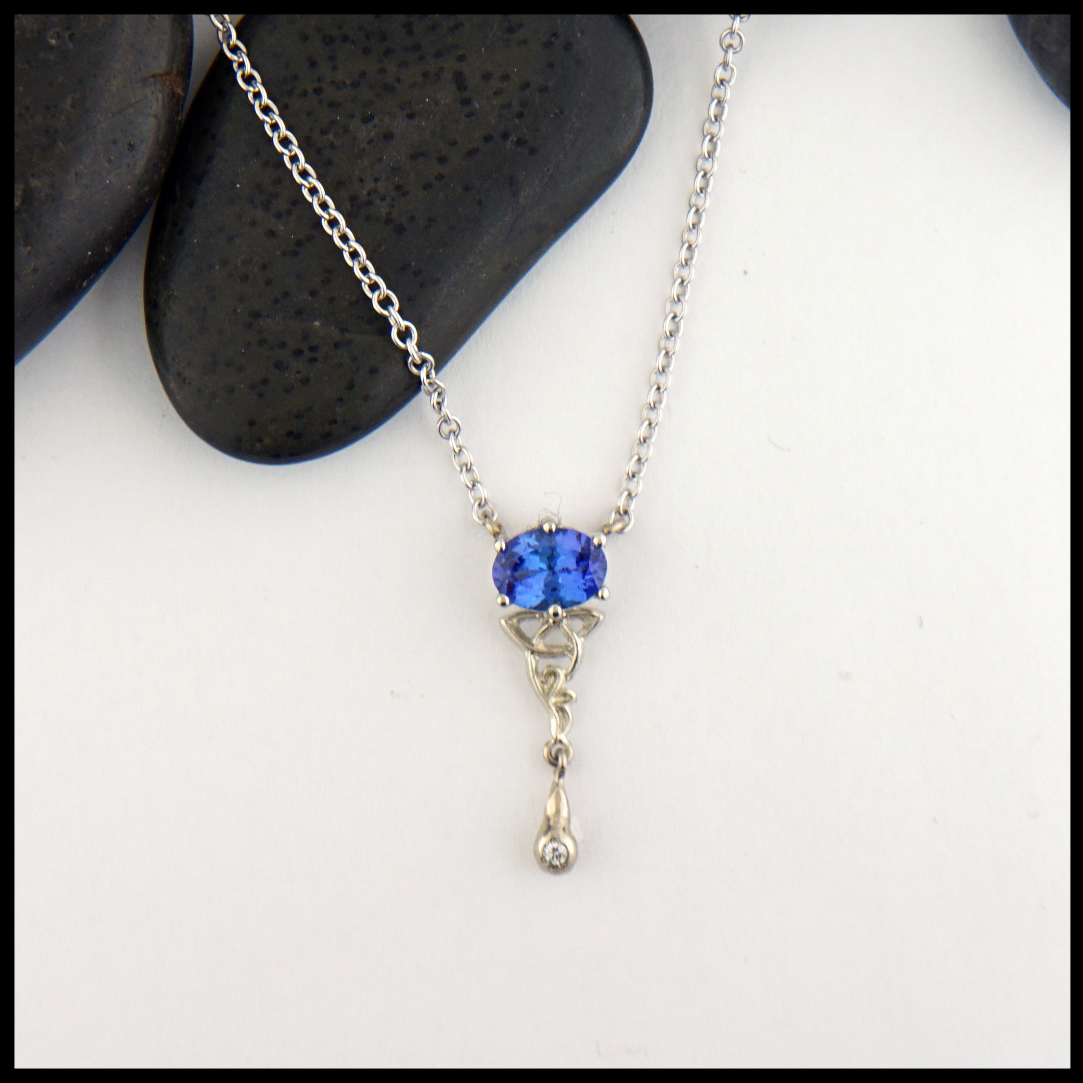 This 14K white gold necklace features a 0.76 tanzanite with a diamond drop accent and trinity knot detail. This pendant is on an 18" attached cable chain.