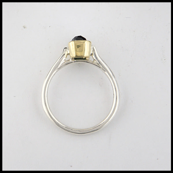 One of a kind Rustic hand fabricated ring in sterling silver features a 18K yellow gold bezel, set with a Rose Cut Blue Green Tourmaline.