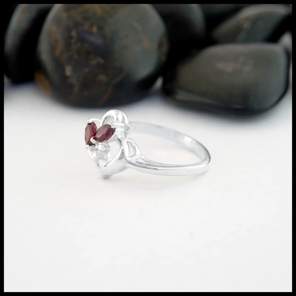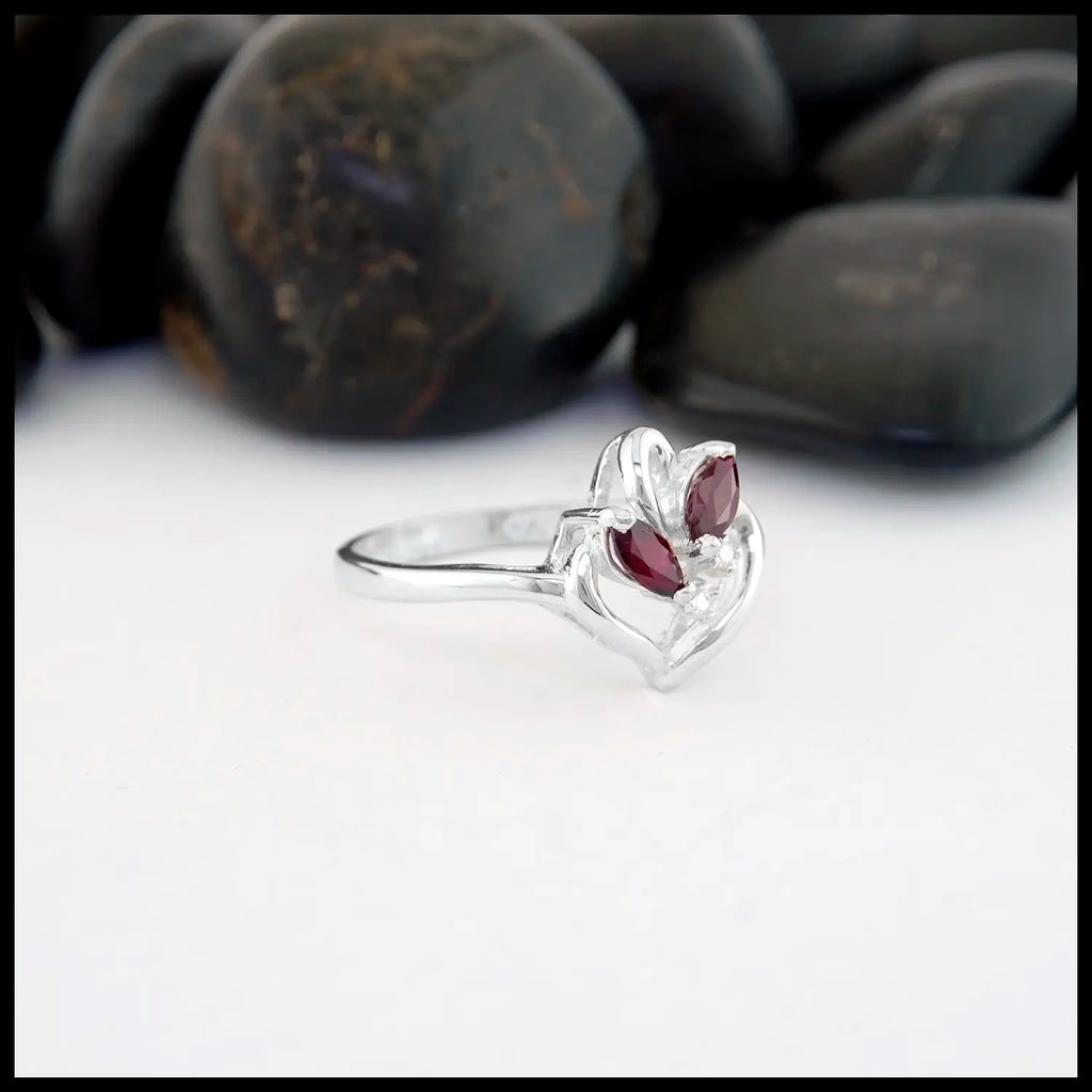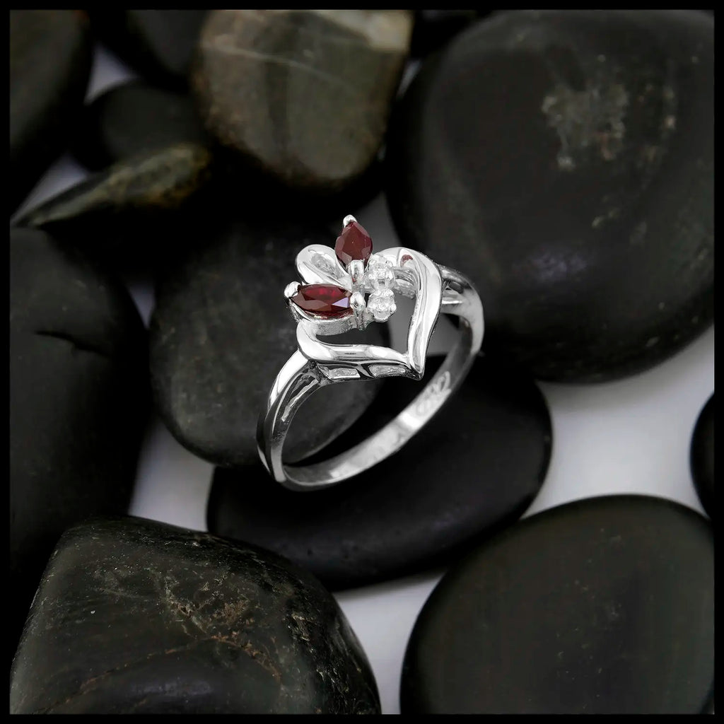 This sterling silver ring was custom handmade to resemble a heart. It is set with two marquise red rubies and each ruby is accented by a diamond. This ring is a size 6 1/2 and can be resized upon request.