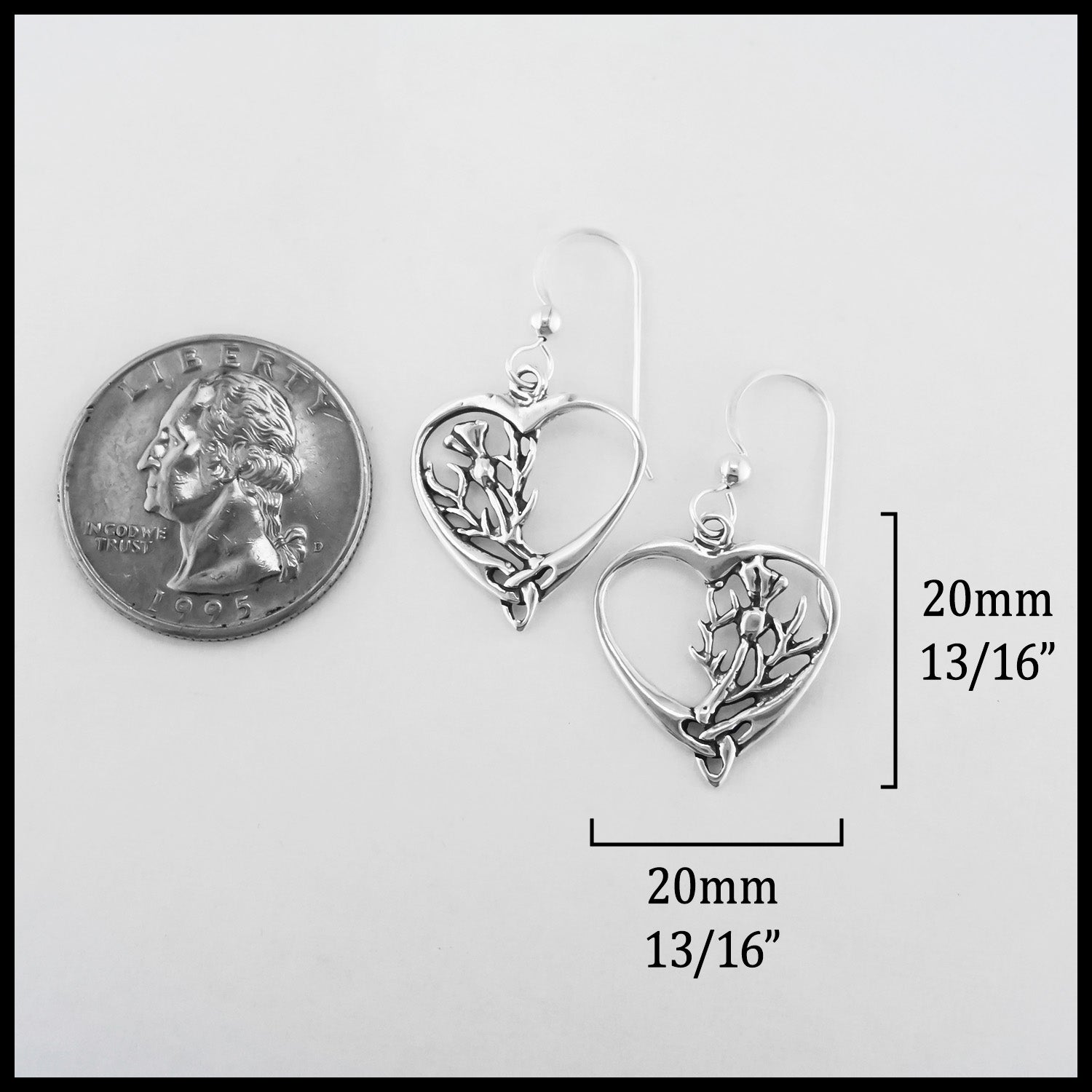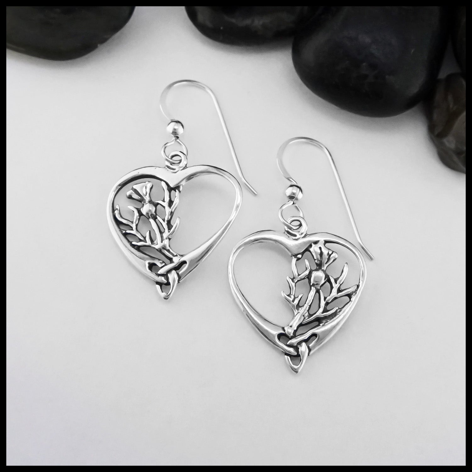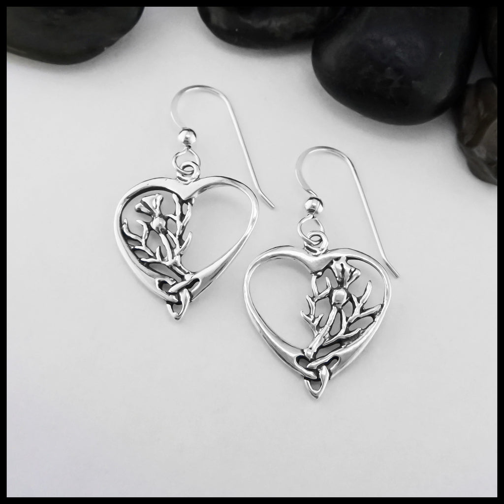 Sterling Silver Celtic Heart Drop Earrings with a triquetra (trinity knot) at the bottom. Detailing in the center is a Scottish Thistle.
