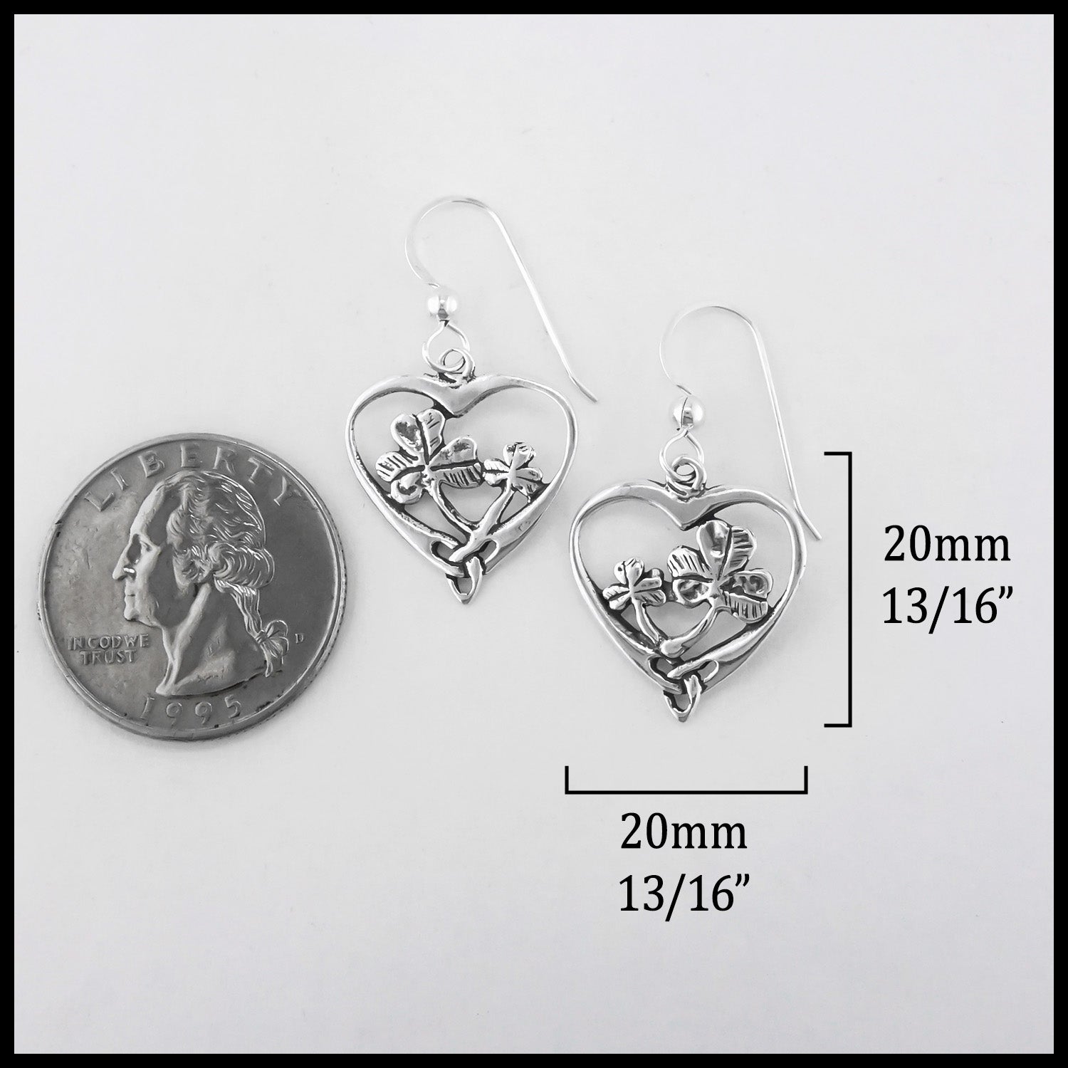 Sterling Silver Celtic Heart Drop Earrings with a triquetra (trinity knot) at the bottom. Detailing in the center is are a large and a small Shamrock.