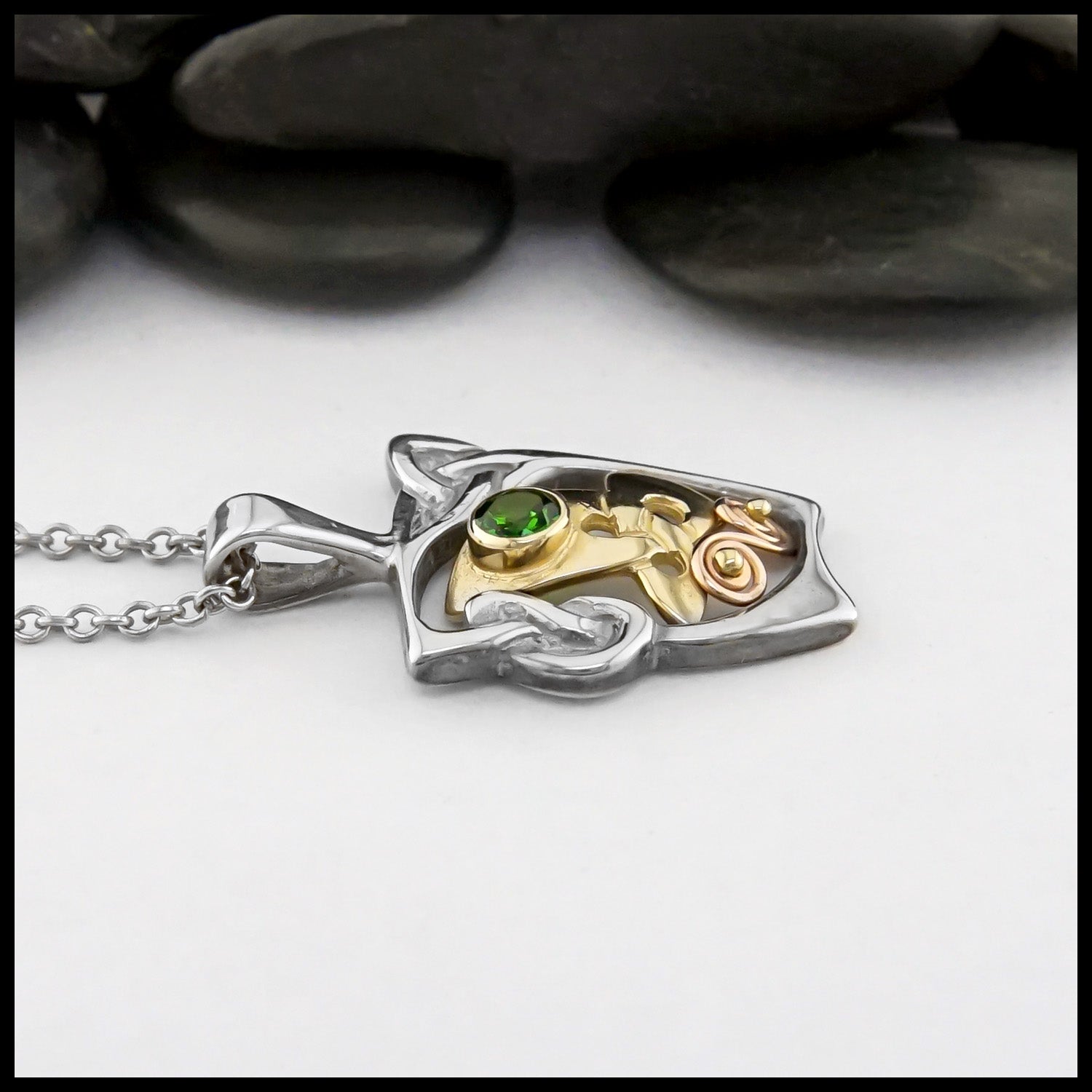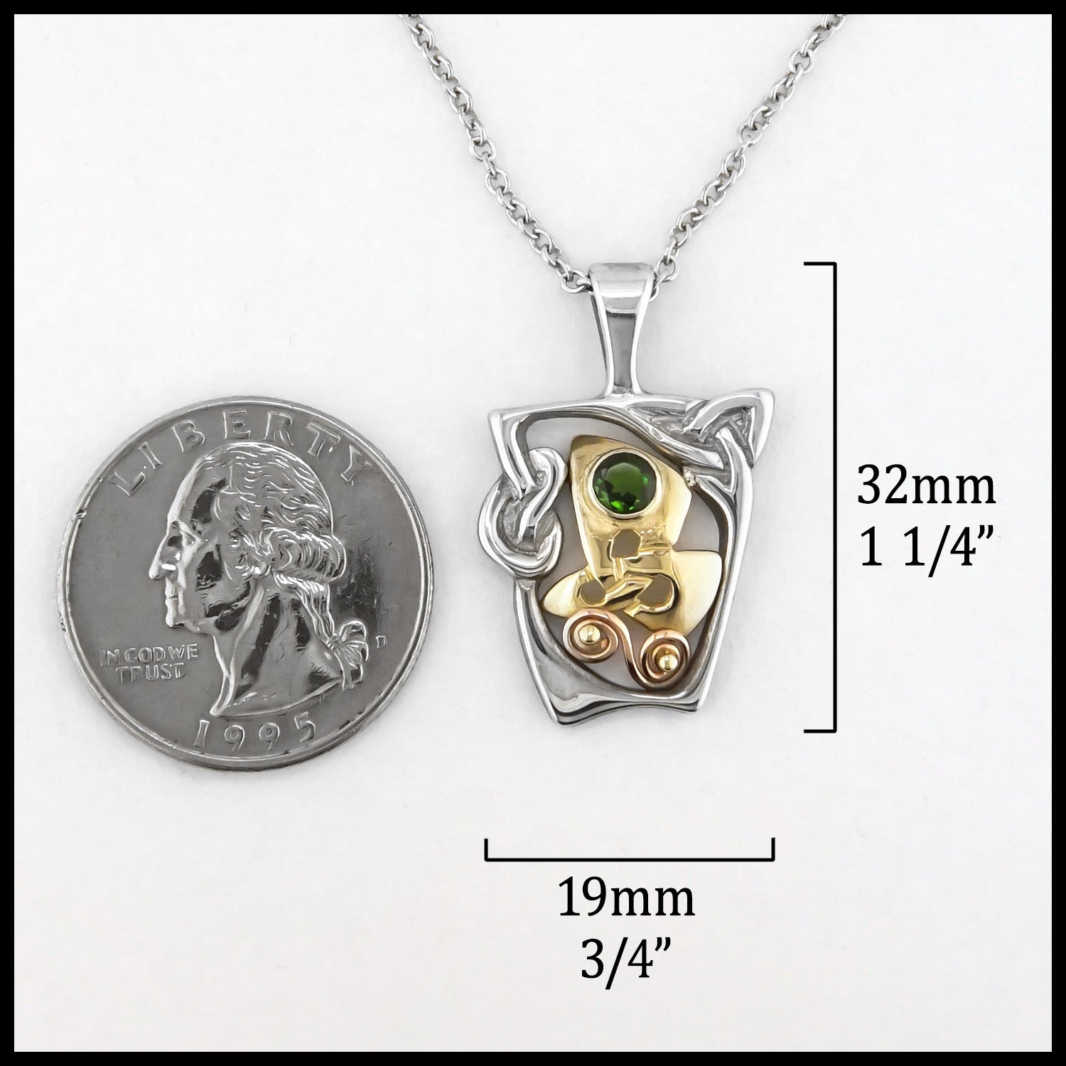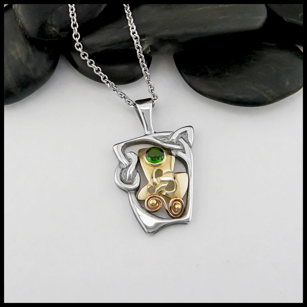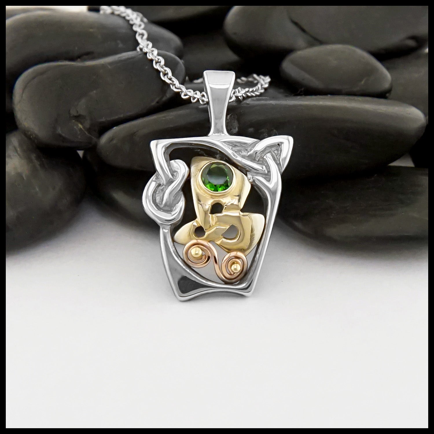 This unique Celtic pendant is crafted from sterling silver and set with a Tsavorite stone. The stone is bezel set in an exaggerated trinity knot in 14K yellow gold, embellished with 14k yellow and rose gold wire and beading filigree. This contemporary piece is sure to stand out and impress. This pendant is featured on an 18" cable chain.
