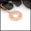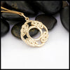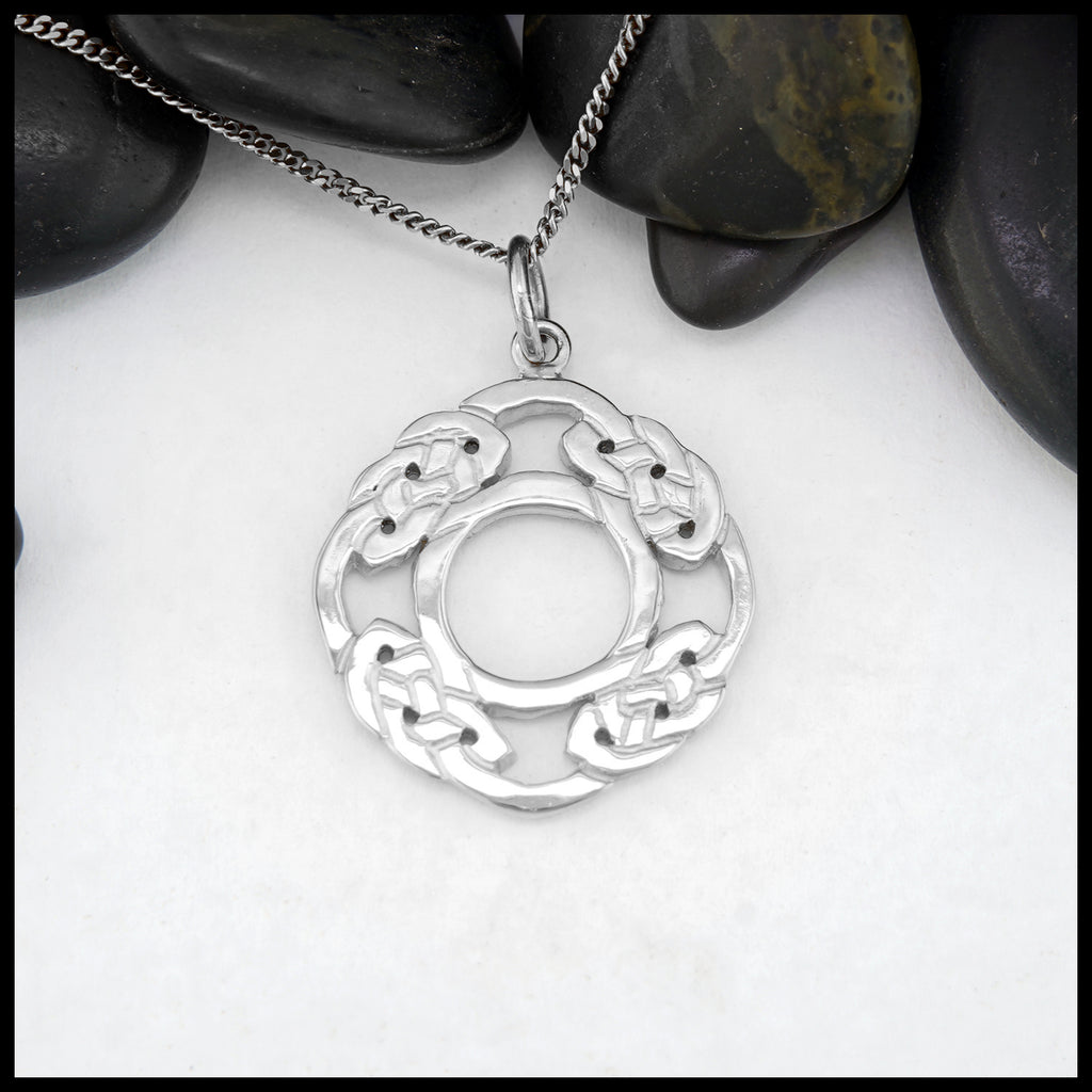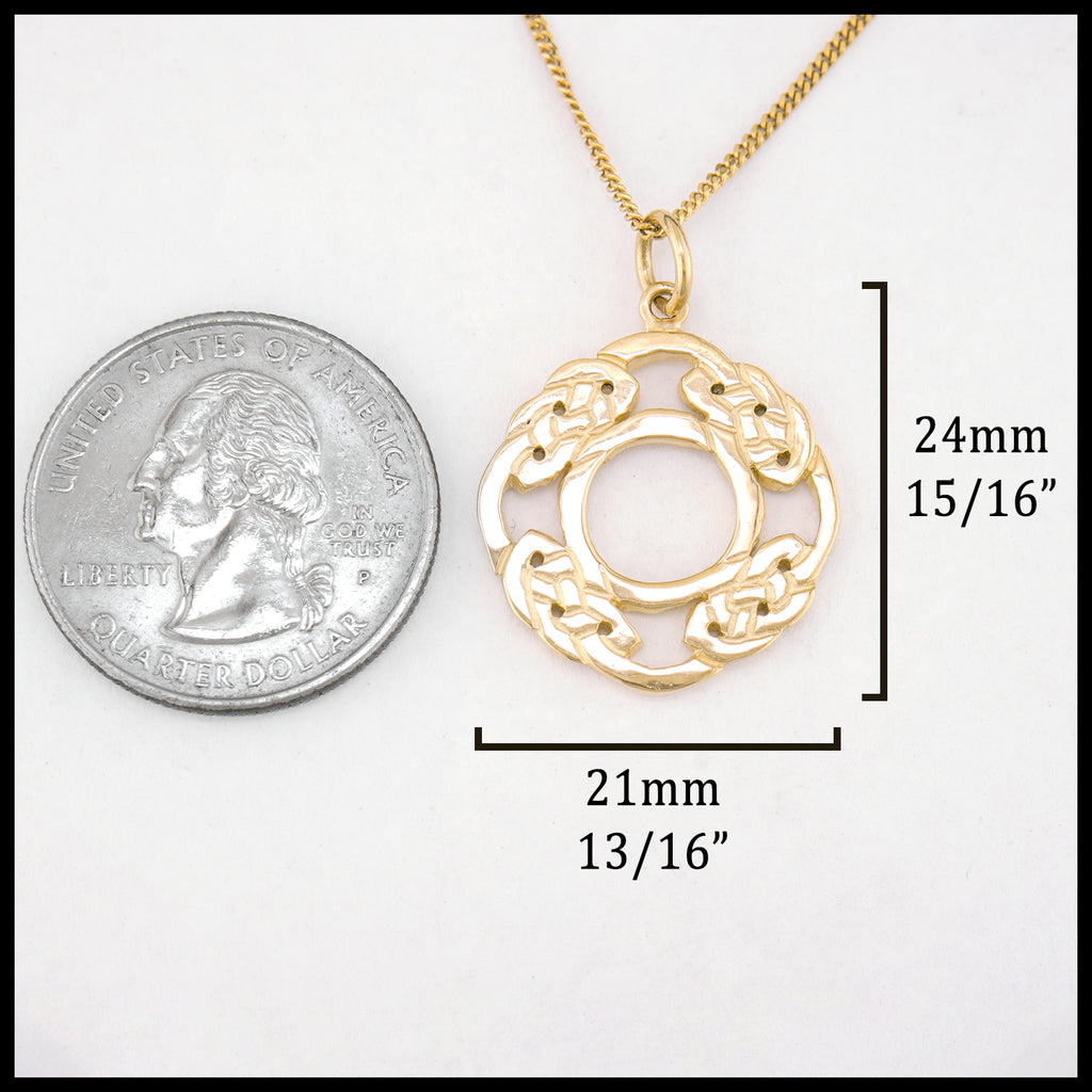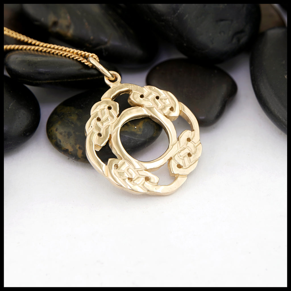 This Síoraí pendant in either: 14K yellow, rose, or white gold, showcases a dazzling display of celtic knot weaving to form the shape of a wreath. This pendant is featured on an 18" light curb chain.