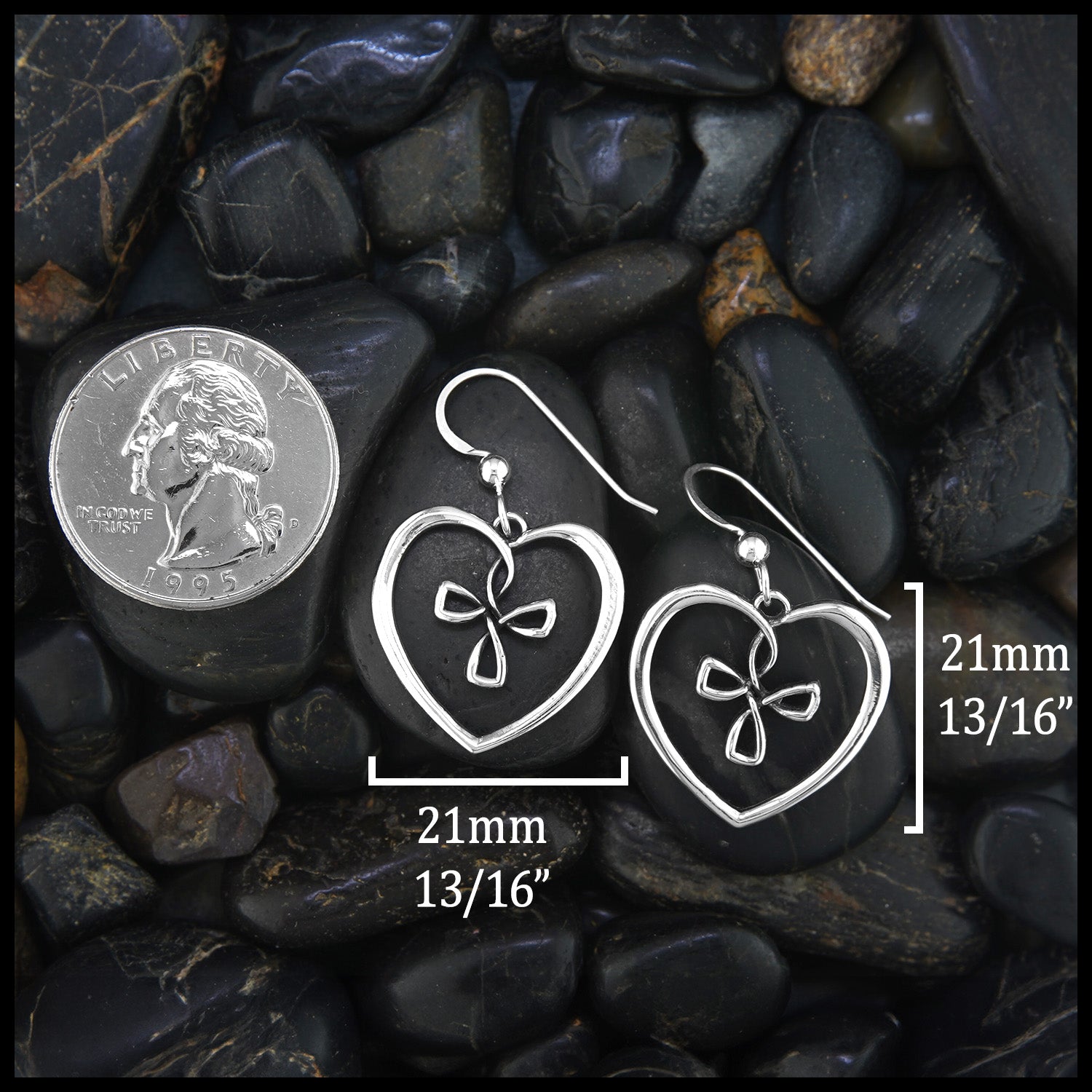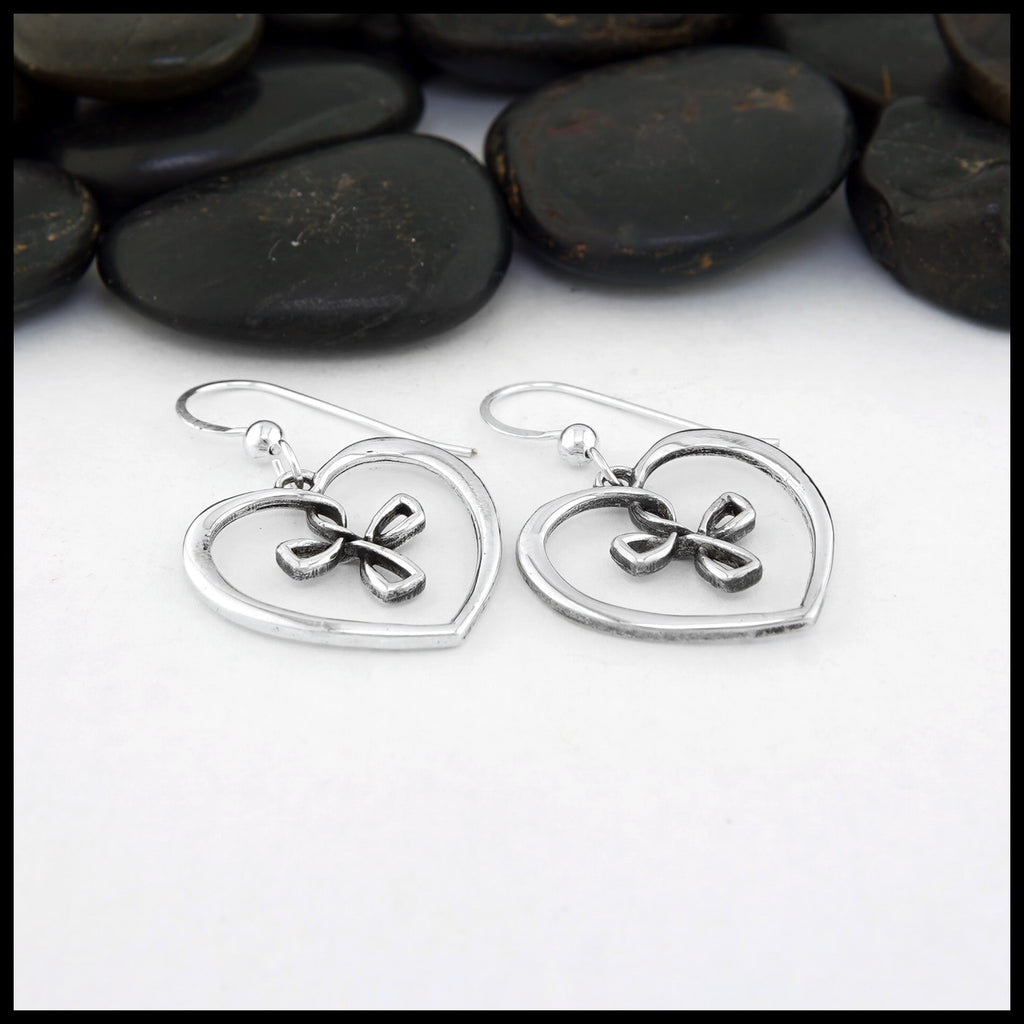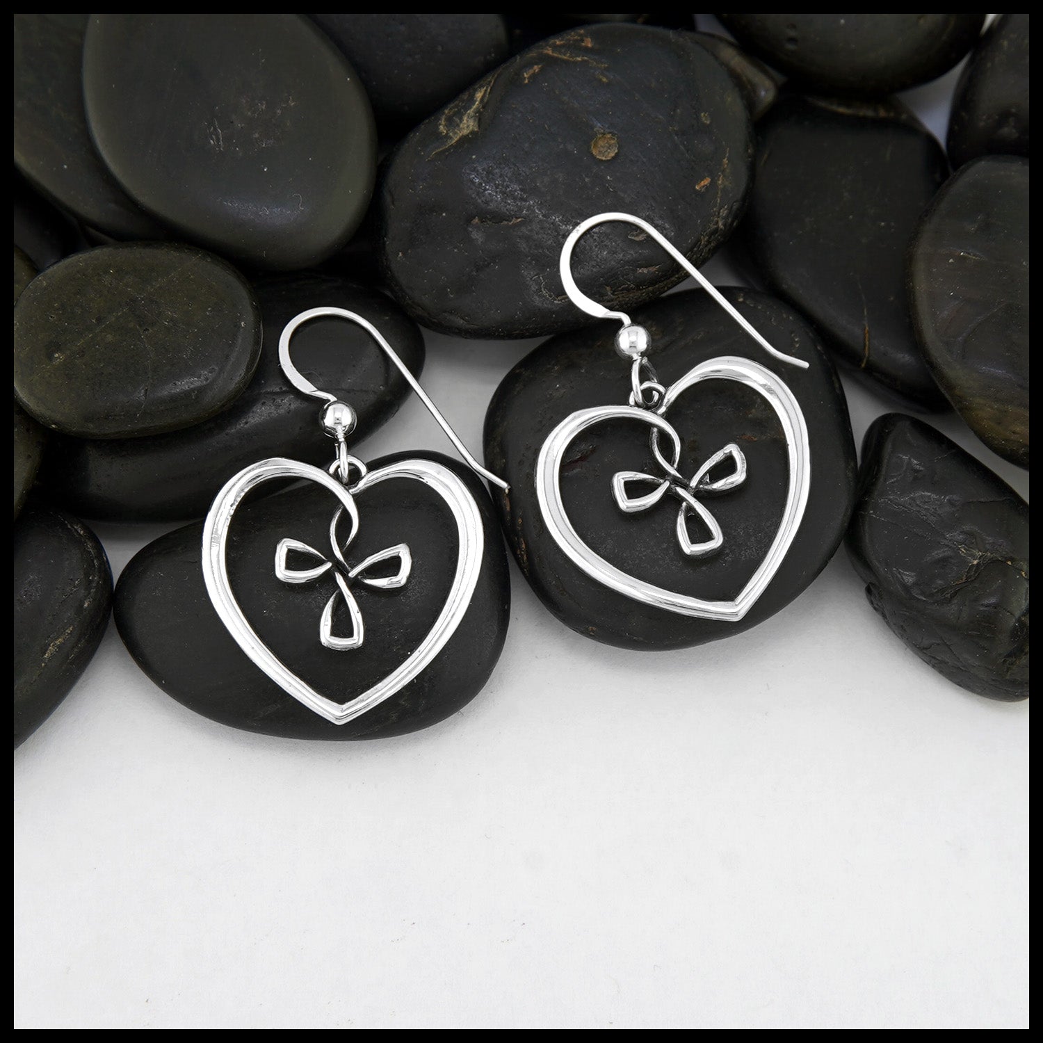 These sterling silver drop earrings are shaped in the form of a heart with a continuous frame twisting to create an open knot cross in the center of the heart.