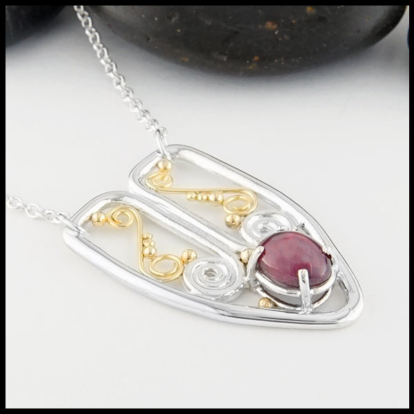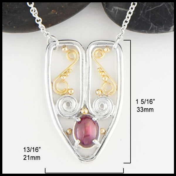 One of a kind Sterling Silver necklace set with a genuine Star Sapphire, featuring spirals and beads in 18K Yellow Gold. Pendant is attached to a 16" cable chain. Only one pendant is available.