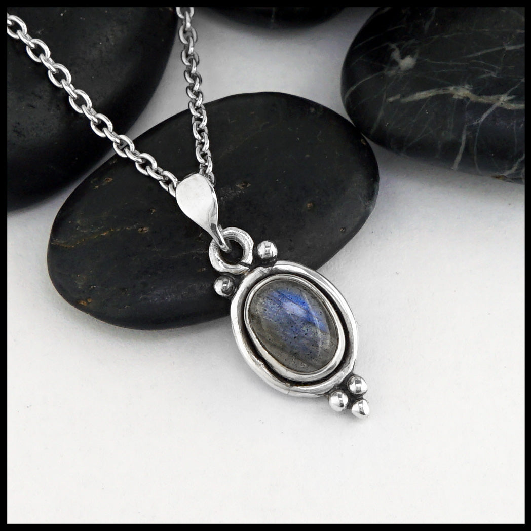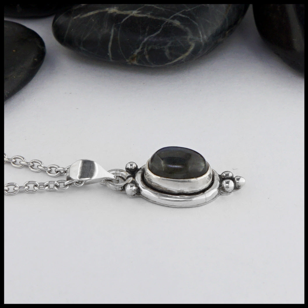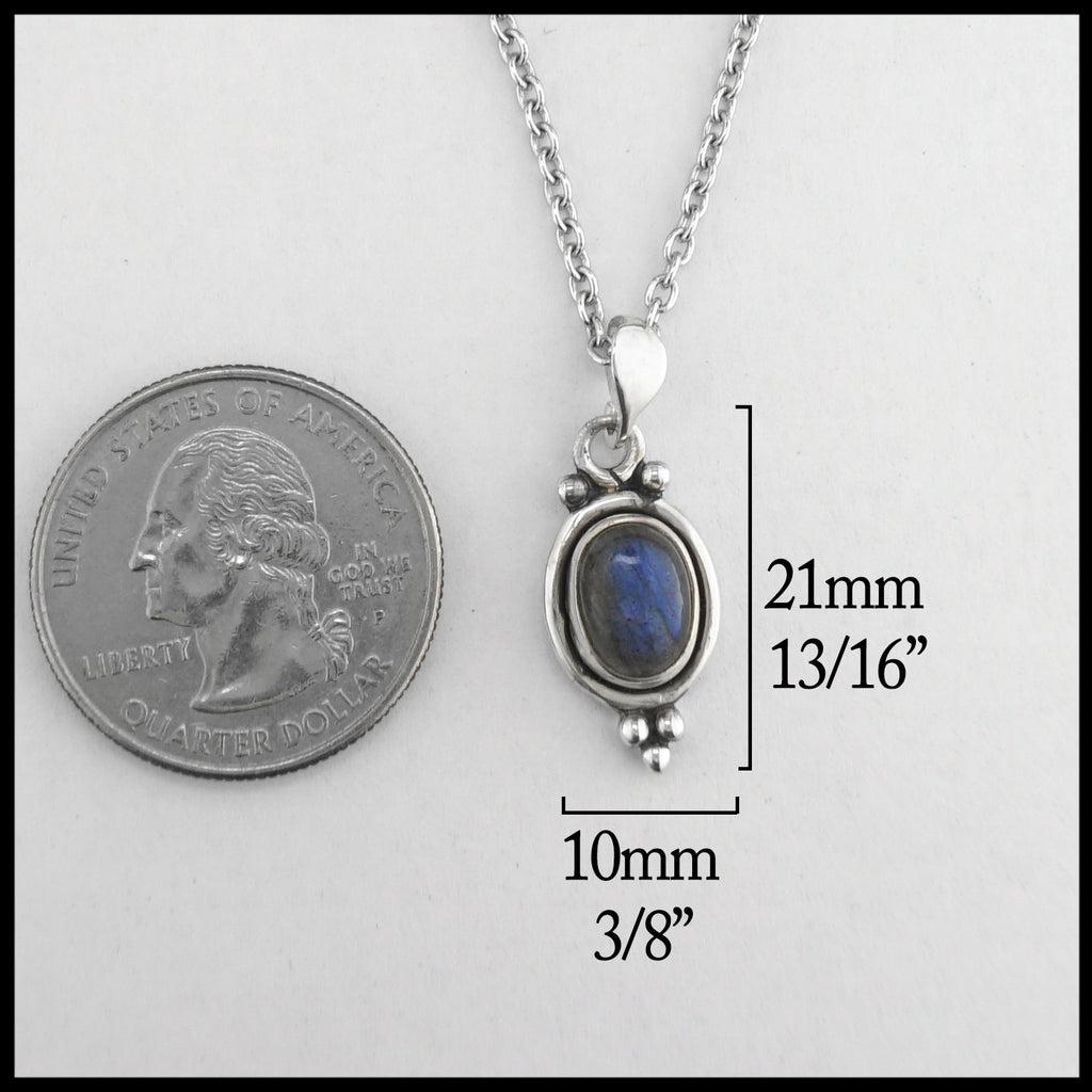 Sterling silver pendant with beading details set with an oval Moonstone. Pendant comes with an 18" chain.