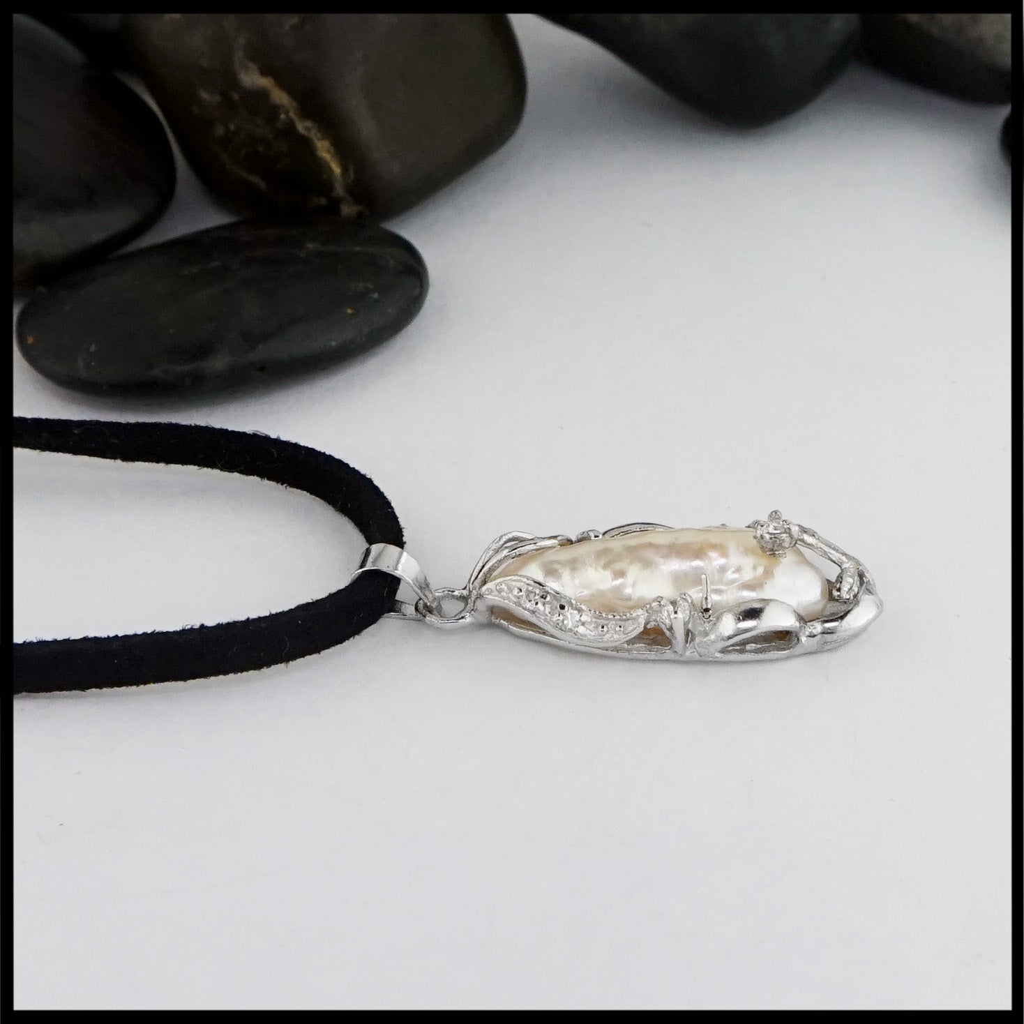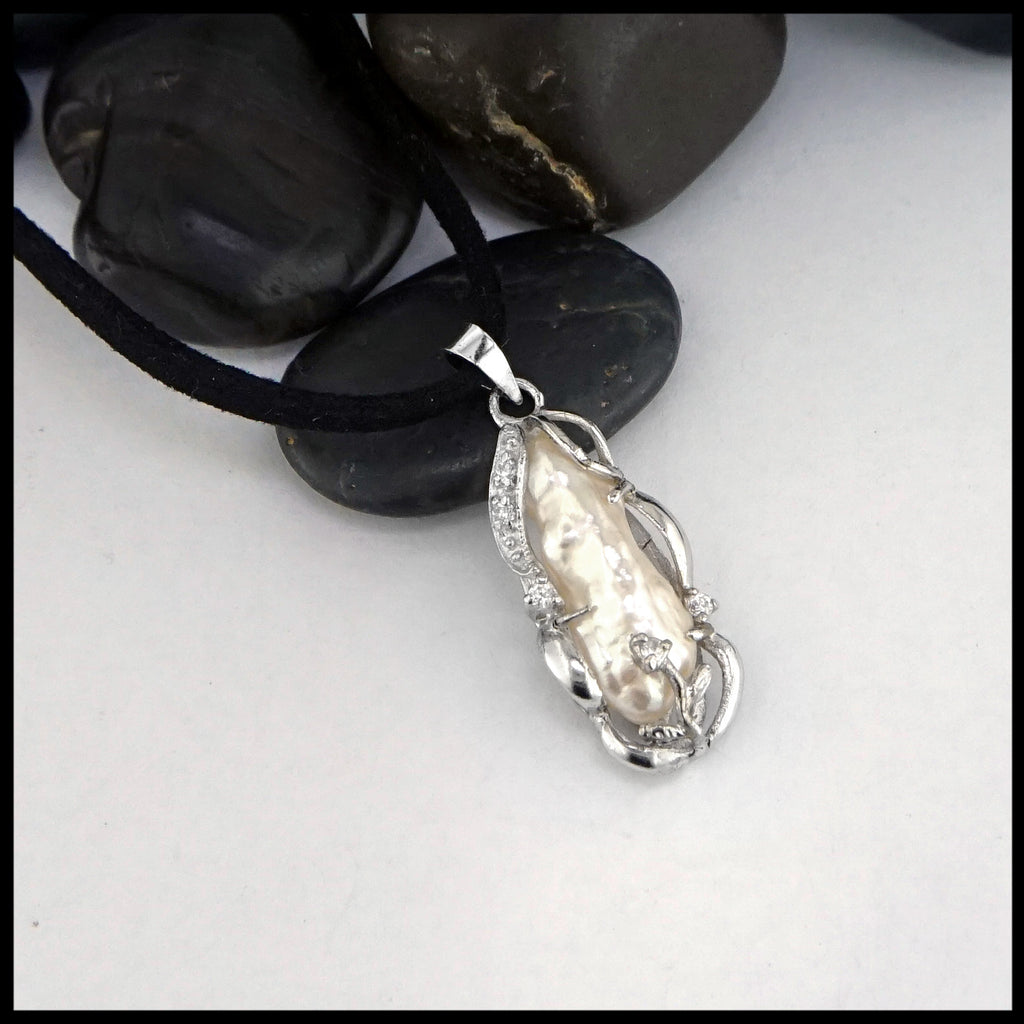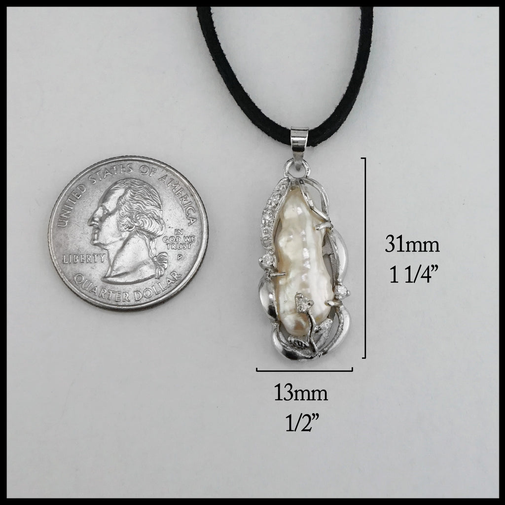 This Sterling Silver pendant is set with a Biwa Pearl. Leaf detailing and clear stones surround the Biwa Pearl. Pendant comes on a black velvet cord.