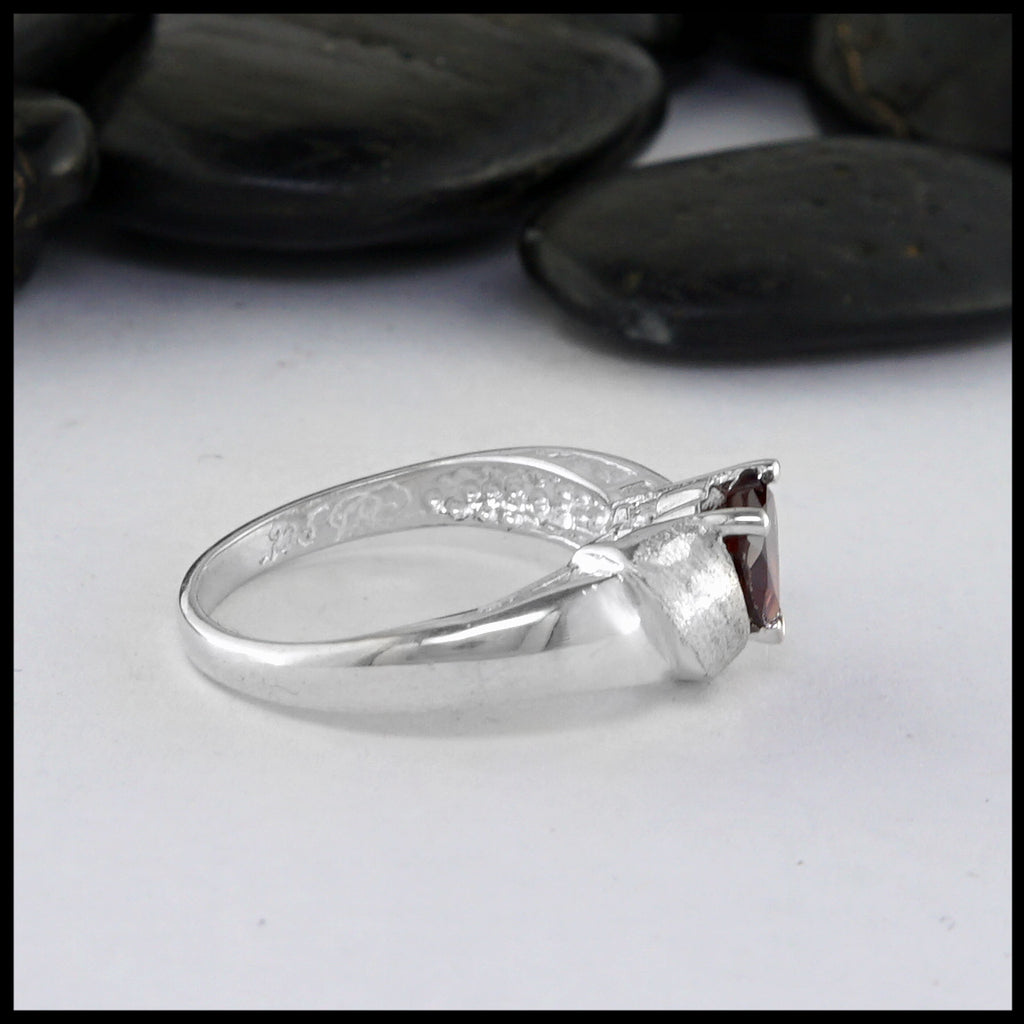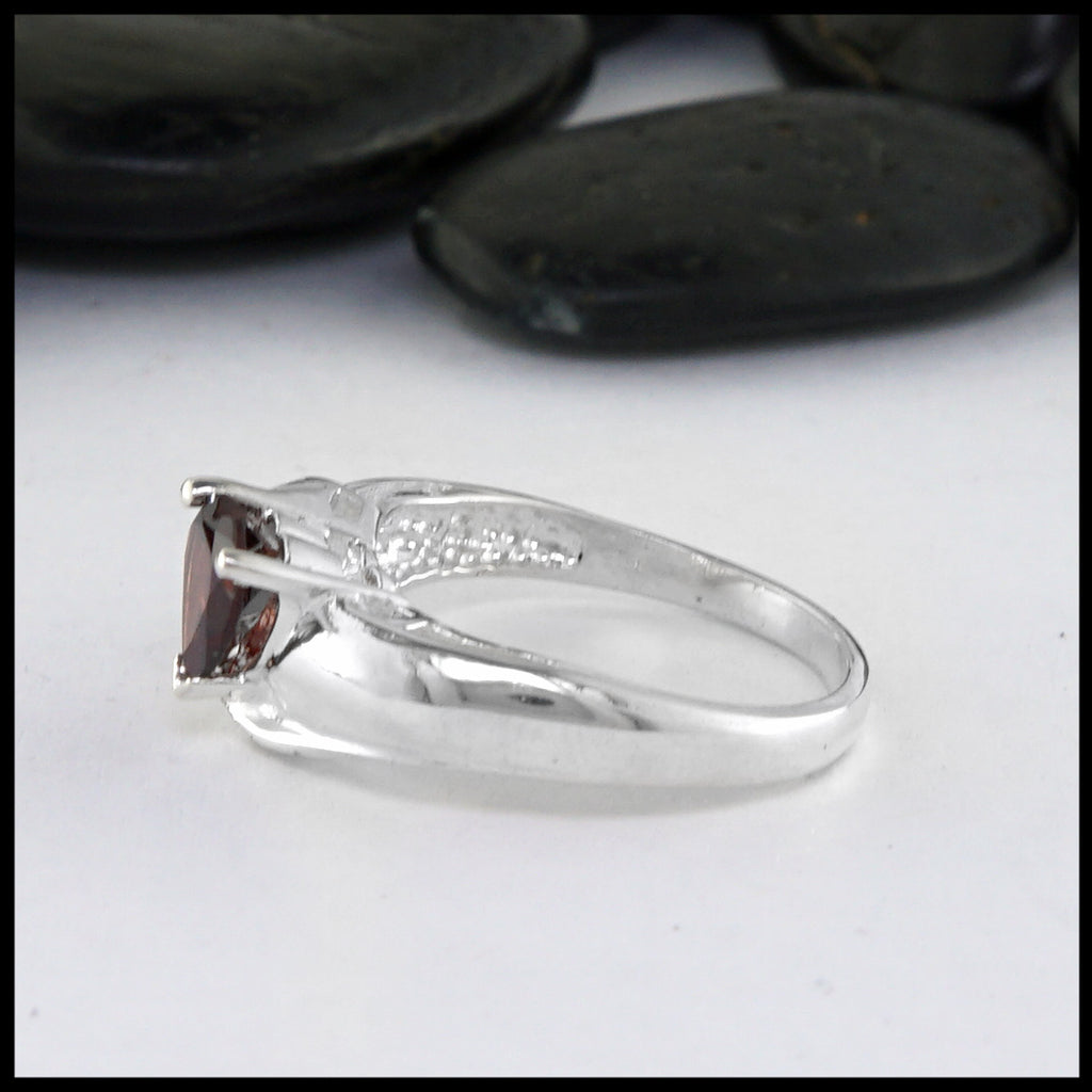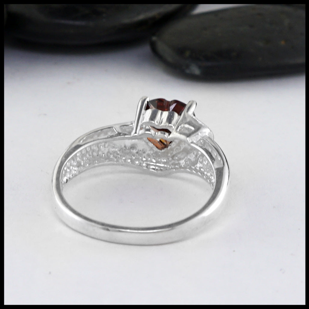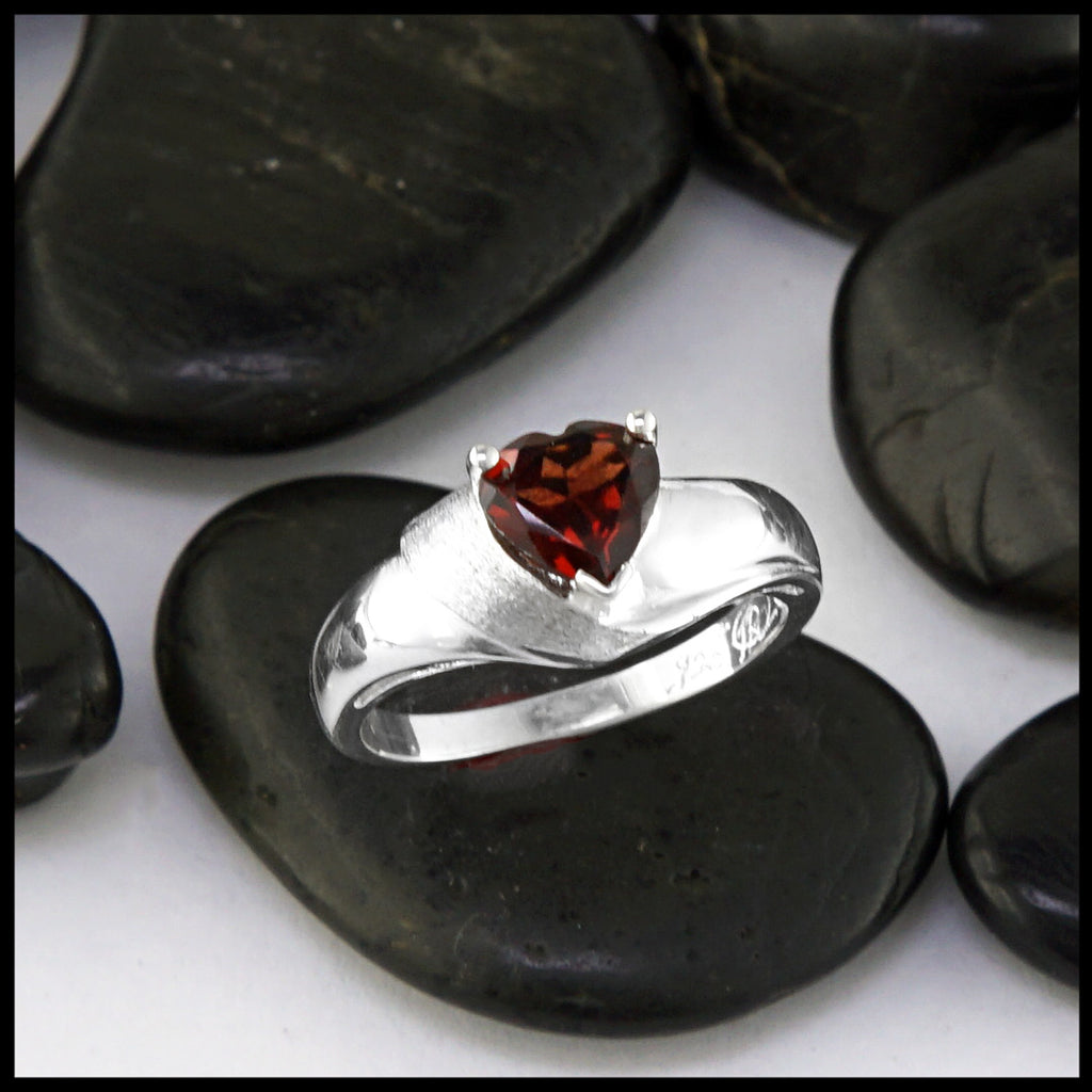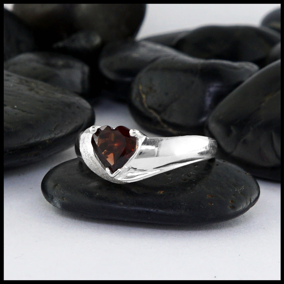 This Sterling Silver ring is set with a Heart Shaped Garnet. This ring is a size 7 1/2.