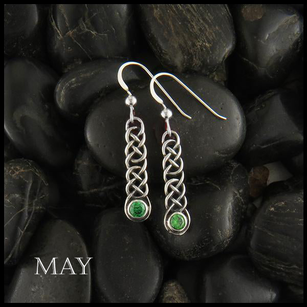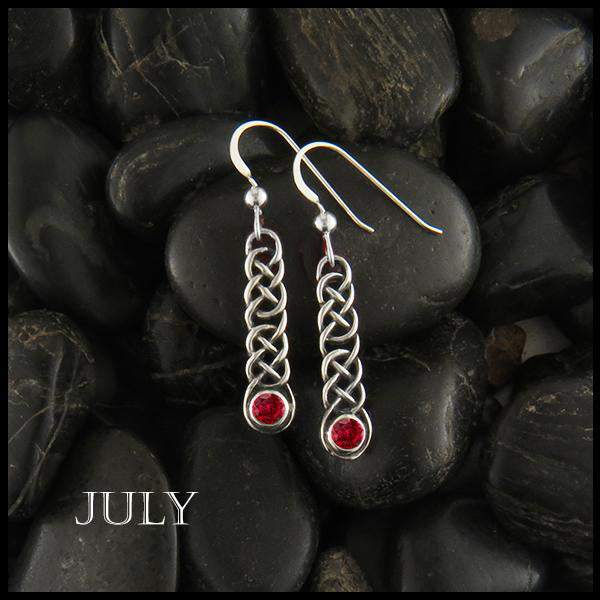These Celtic drop earrings are adorned with a 4mm synthetic birthstone of your own choosing, held by a Josephine's knot. Just let us know in the options what month you would like!