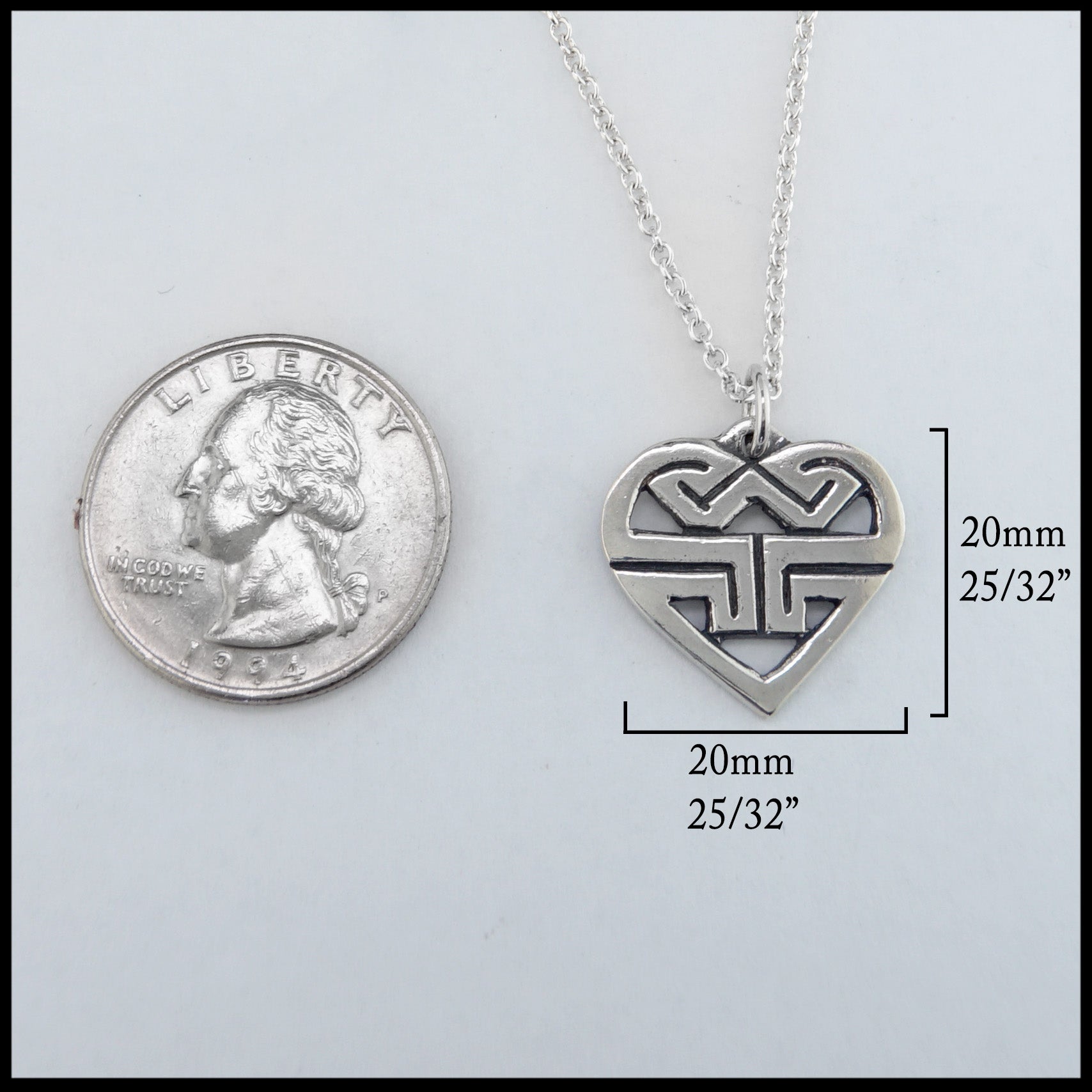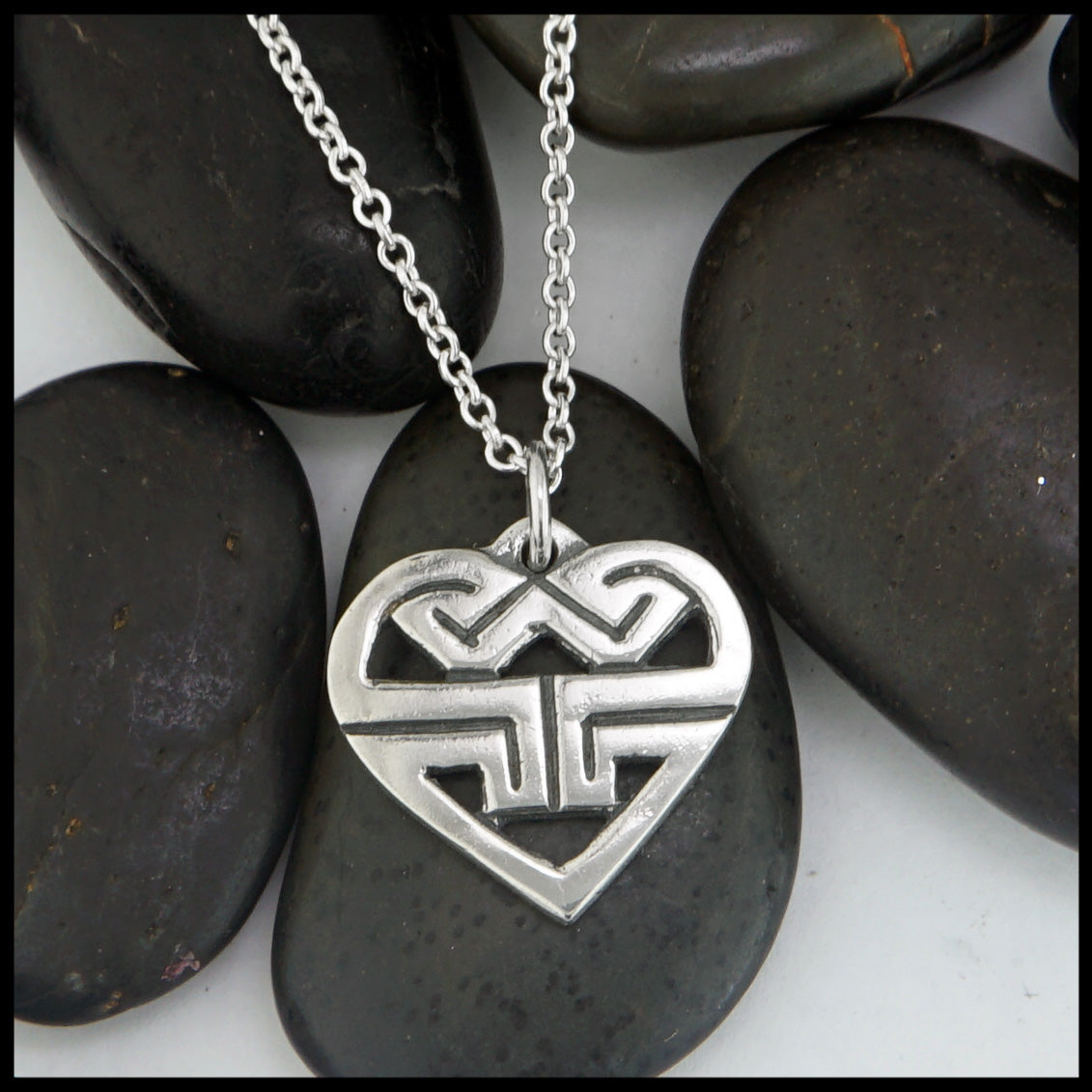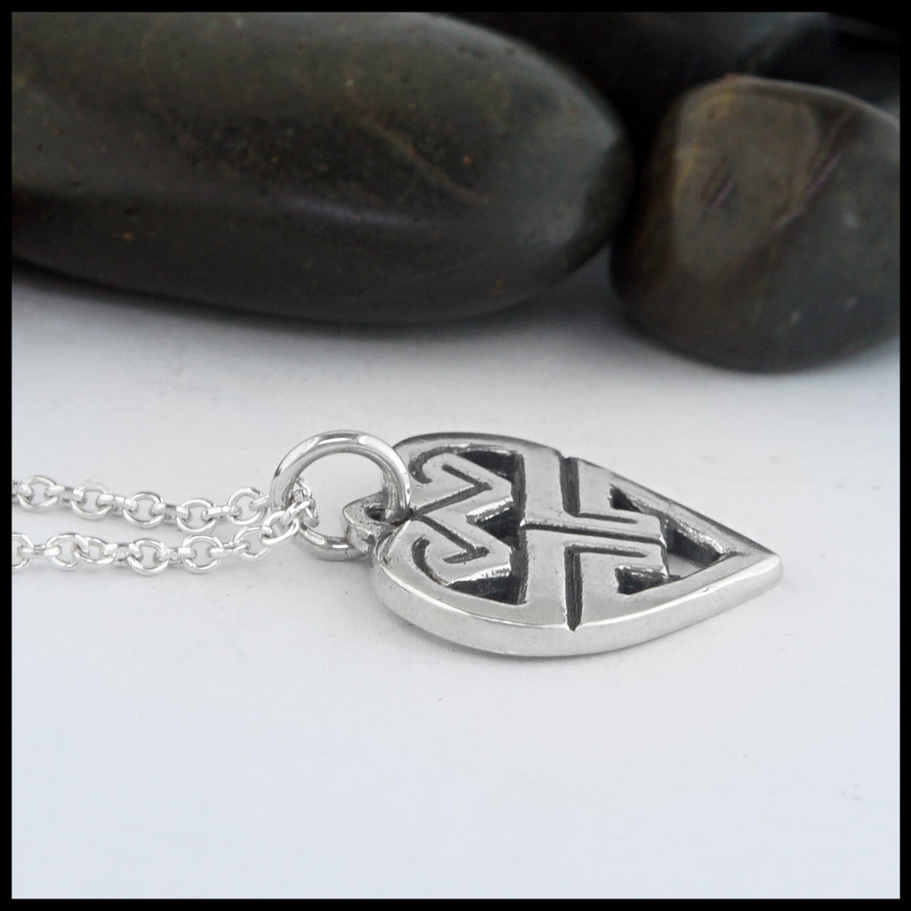 The Sylvia's Heart pendant in sterling silver was designed by Stephen Walker to celebrate his granddaughter Sylvia. The Pictish key patterns form a W at the top welcoming her to the Walker family. The pendant shown on an 18" Sterling Silver Cable Chain