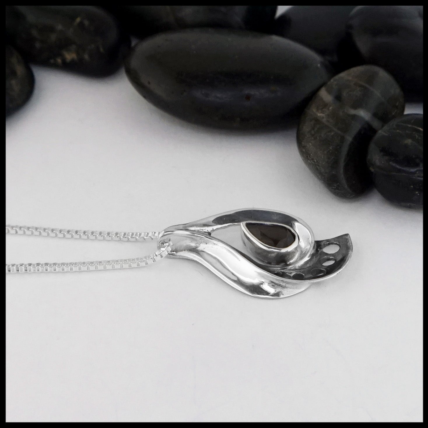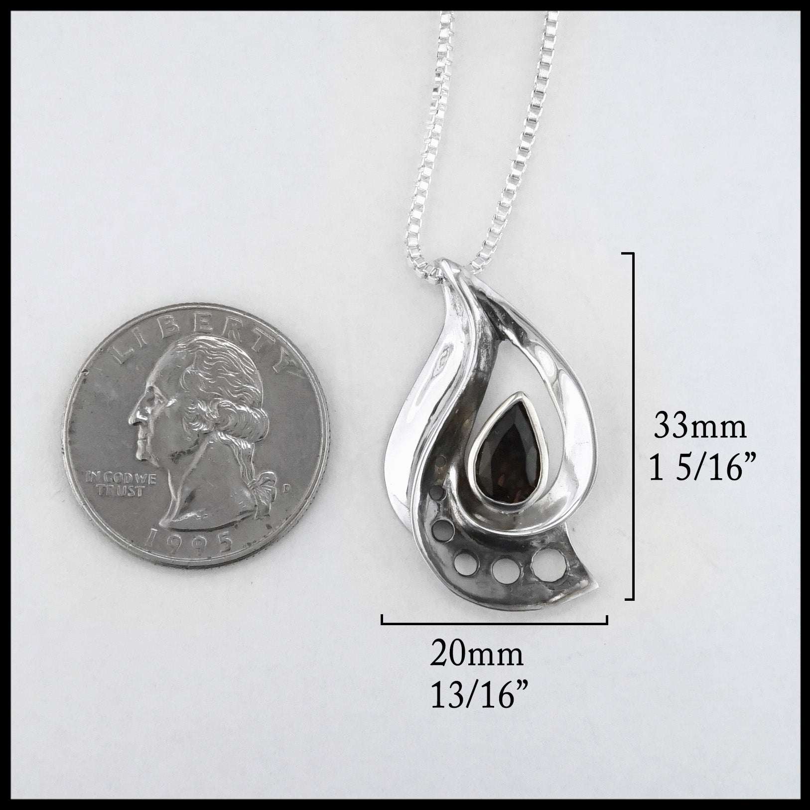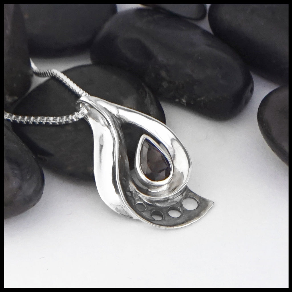 This Sterling Silver pendant is tear drop shaped and set with a Smokey Topaz. Pendant comes with a Sterling Silver chain.