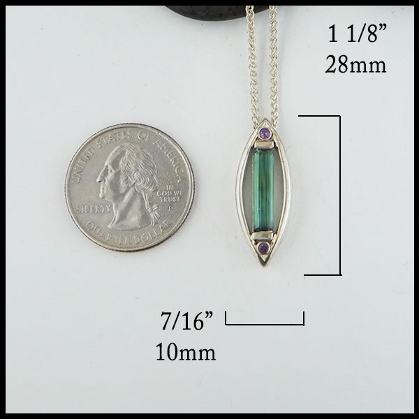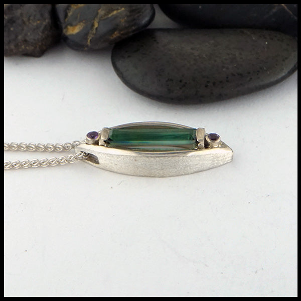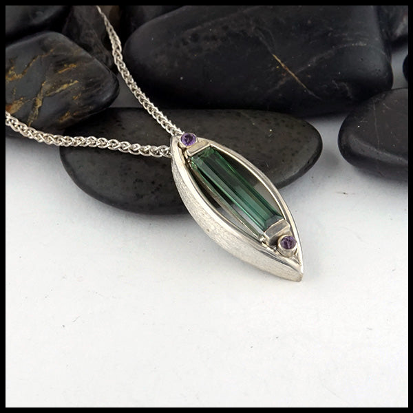 Sterling Silver pendant set with a center Green Tourmaline and accent Amethyst. Comes on a 18" Wheat Chain.