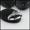 The Triquetra—three interlocking loops with no beginning and no end—has been embraced during the Celtic Revival as a symbol of the Holy Trinity. This elegant ring features small triquetra symbols on the shoulders flanking a 5mm Montana sapphire in a six-prong setting, with beaded milgrain detail running along the band. Montana sapphire is prized for its distinctive teal to blue-green color and exceptional natural clarity—a meaningful choice for those who value both Celtic heritage and the unique character of an American-mined gemstone.