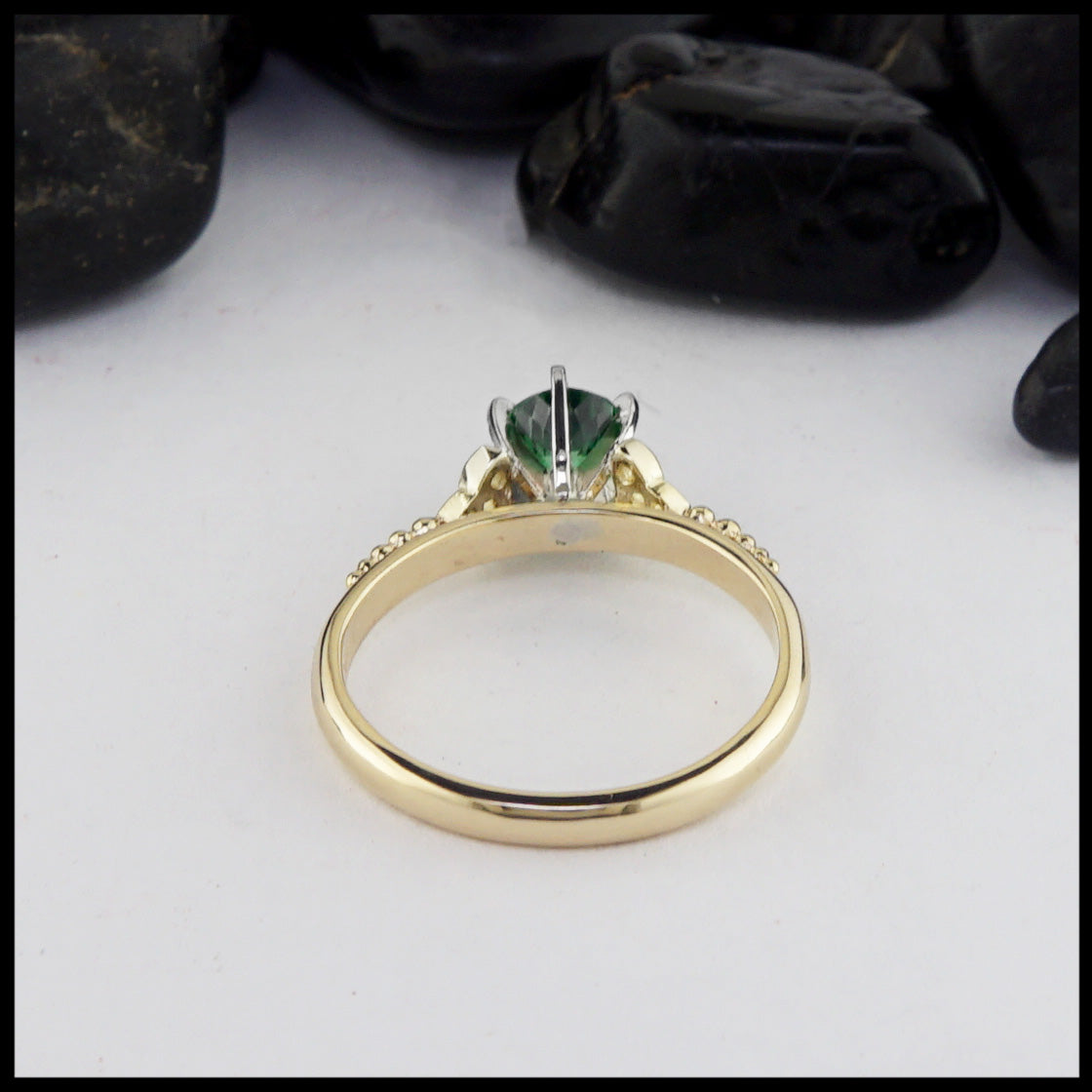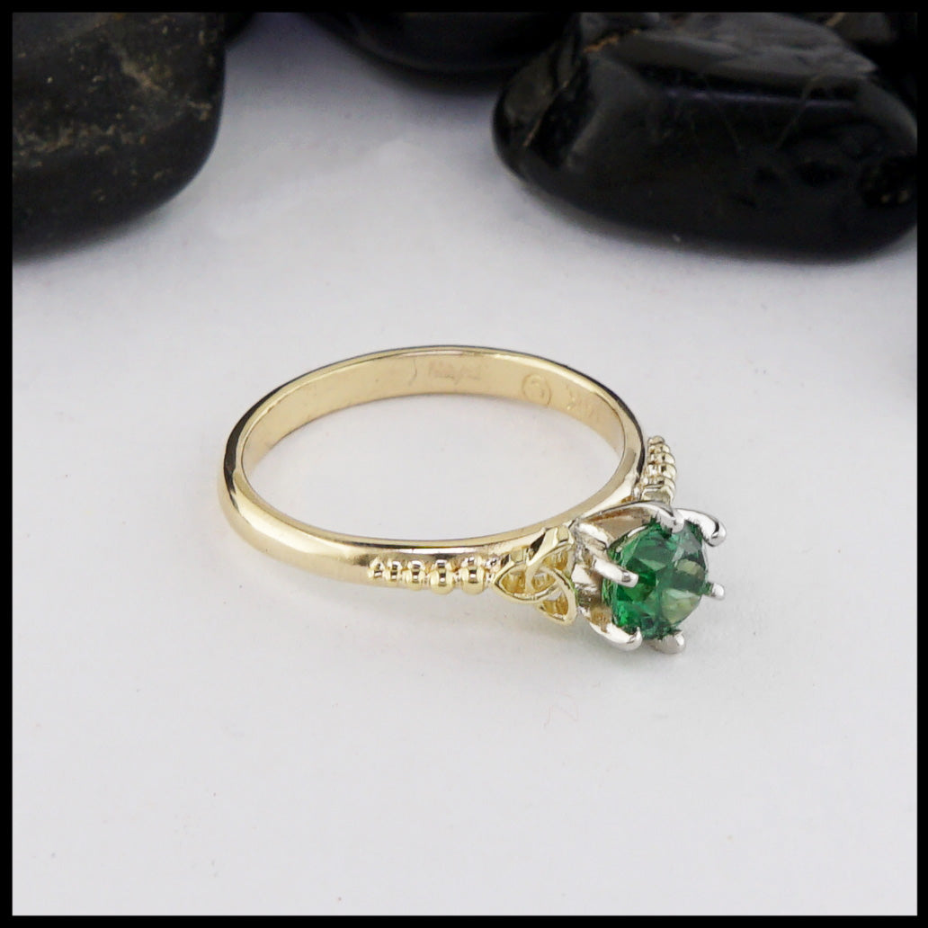 Trinity Knot ring in 14K Yellow Gold. There are trinity knots on either side of the Tsavorite stone. Pictured ring is a size 7 1/2.