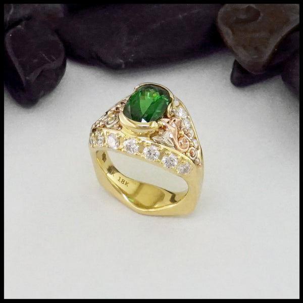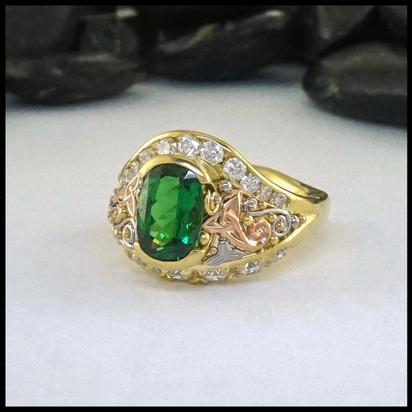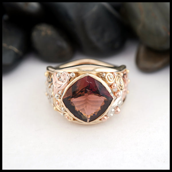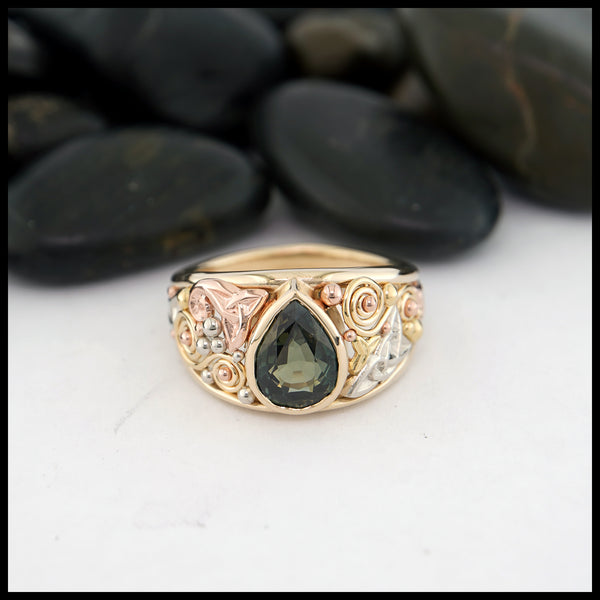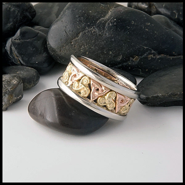 Celtic ring available in a combination of 14K Yellow, Rose or White Gold. This ring has two rails and the interior is alternating Trinity Knots and Triskeles.