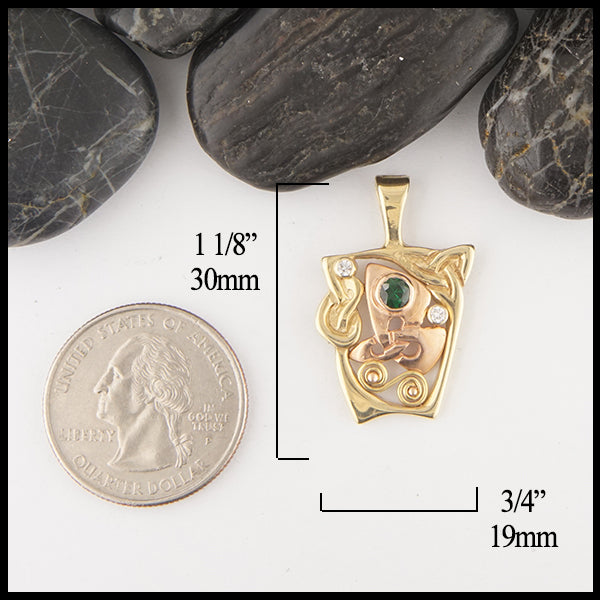 Pendant in 14K Yellow Gold with 18K Yellow and 14K Rose Gold details. pendant is set with a 4mm Tsavorite Garnet and two 2mm diamonds.  This pendant does not come with a chain.