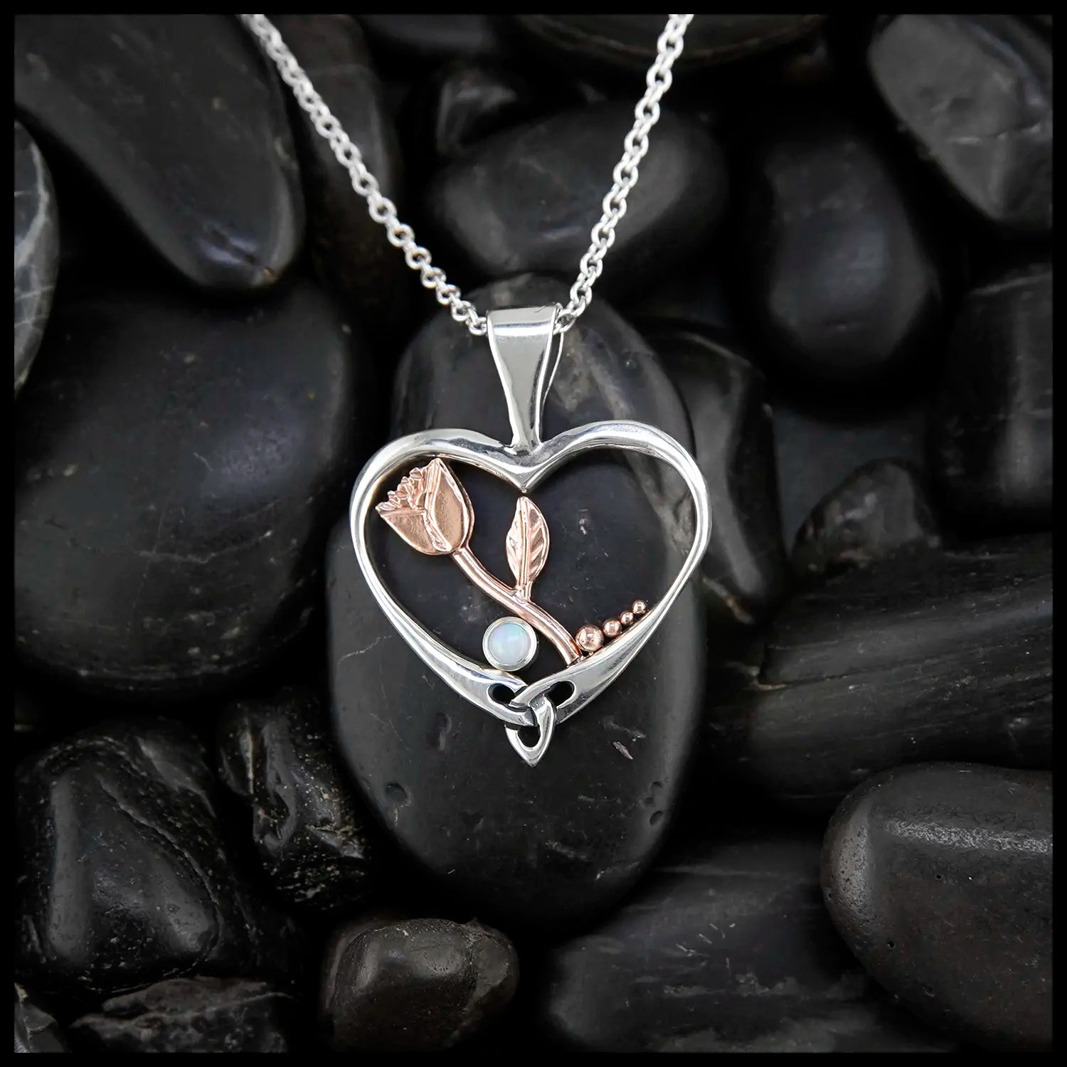 Set in Sterling Silver, this Pendant features 3mm Bezel Set Opals. Accenting the heart shaped frame are 14K Rose Gold Roses and Beading Details! Created by our craftsman Nicole, this pendant comes with an 18" Cable Chain.