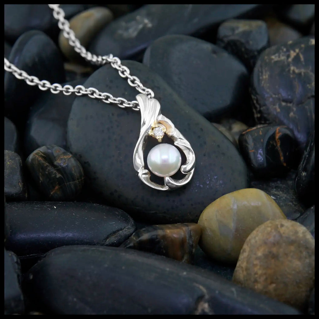 This dainty pendant holds a gorgeous pearl set in a wave inspired custom sterling silver frame. Accenting the pearl is a diamond resting above set in 14K yellow gold prongs. This pendant comes with an 18" cable chain.