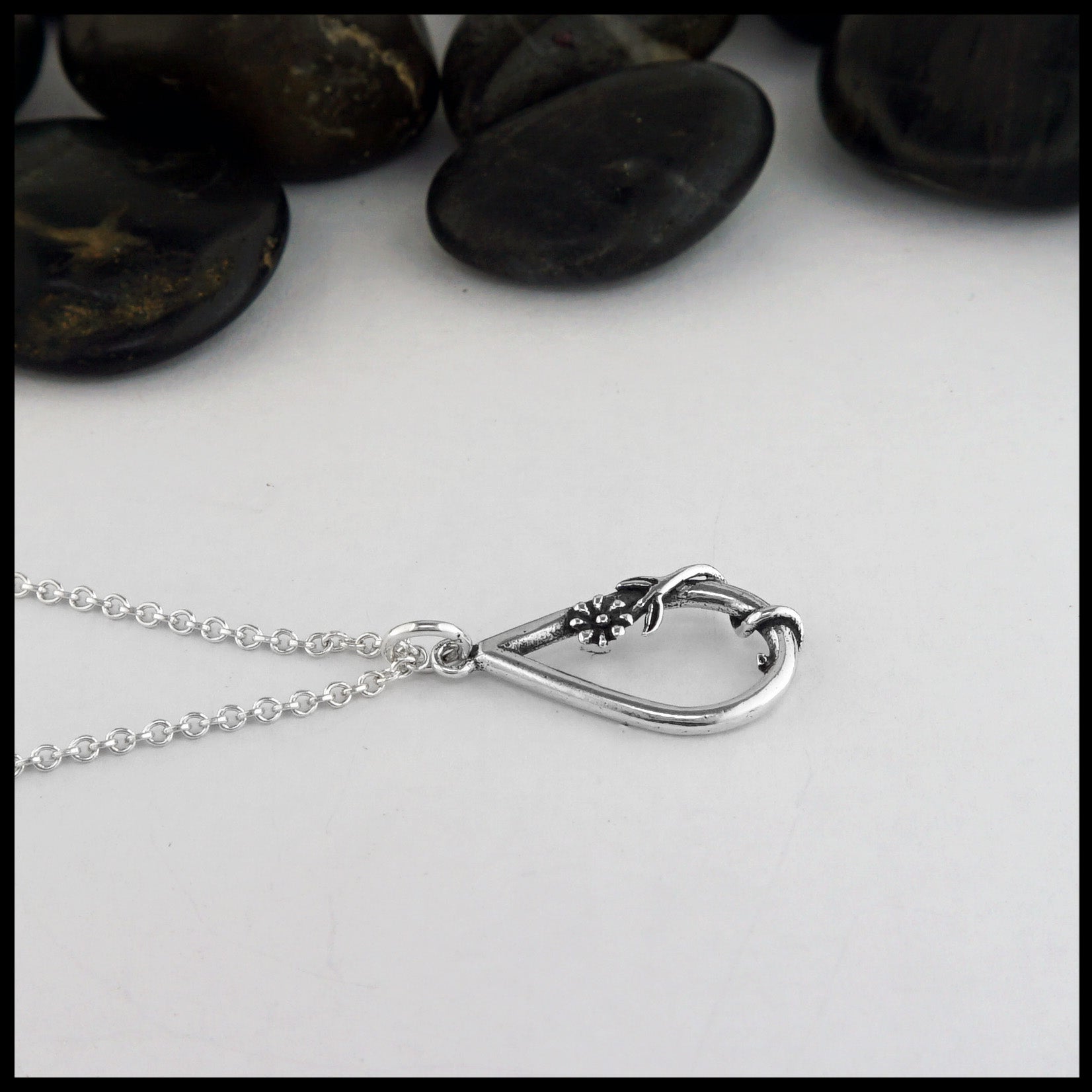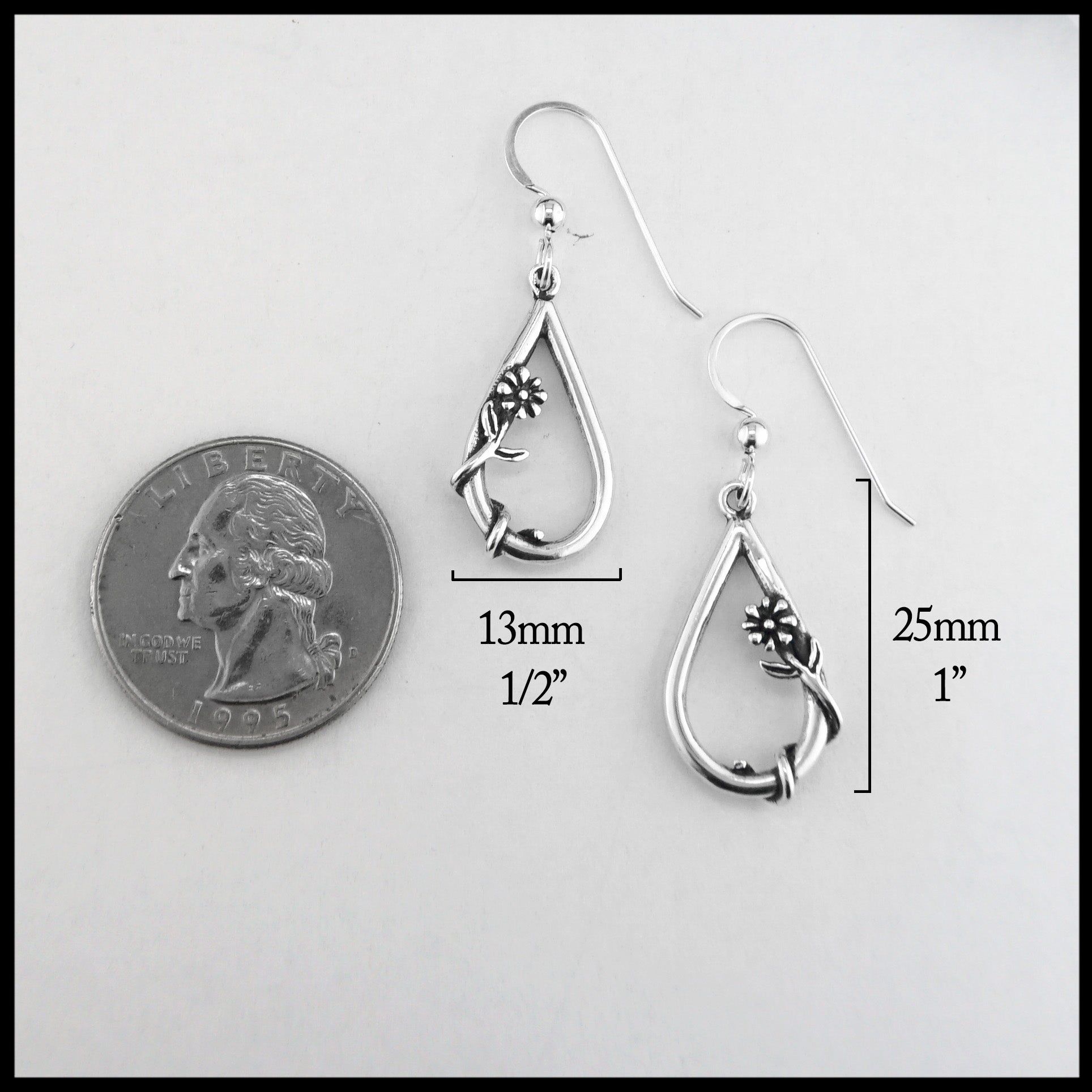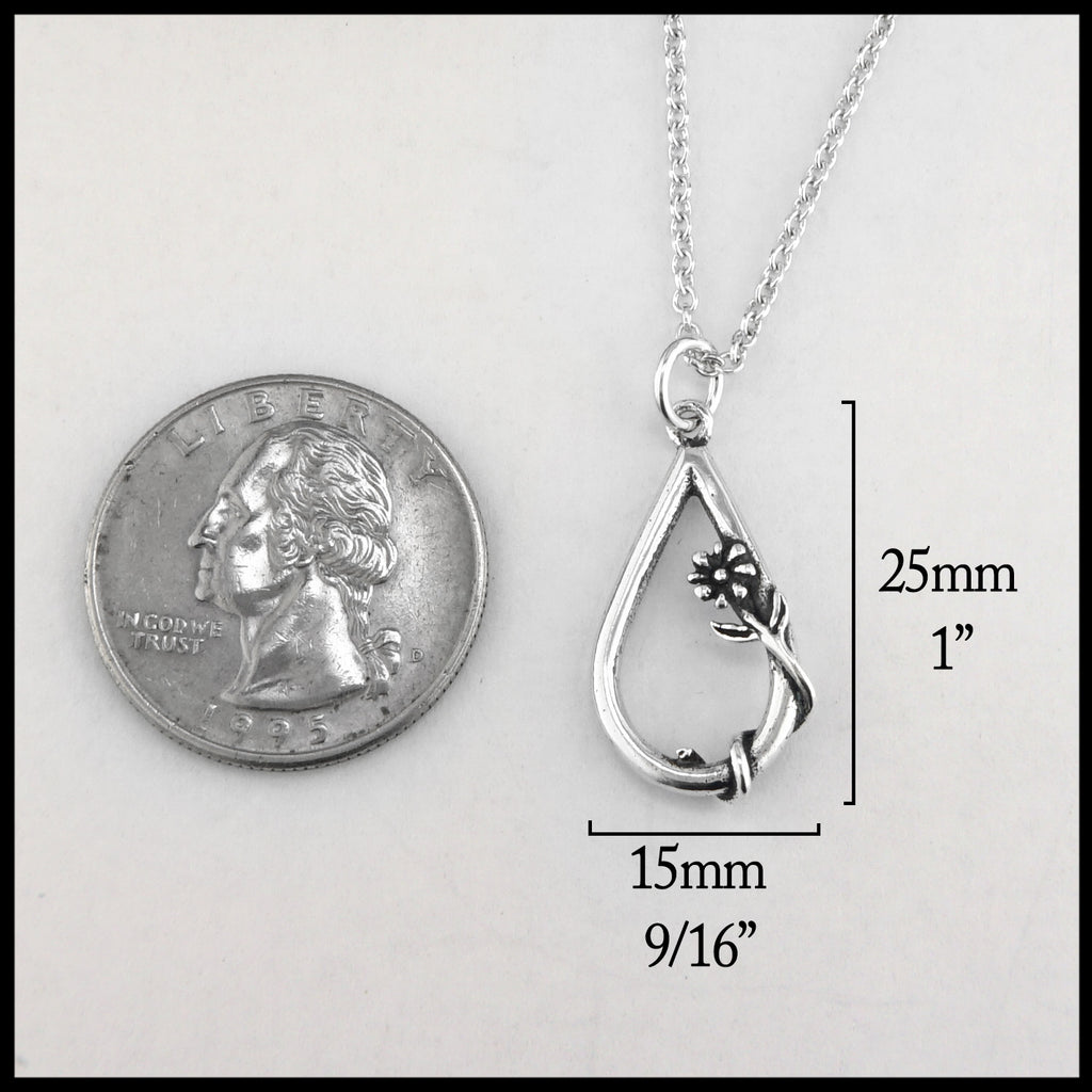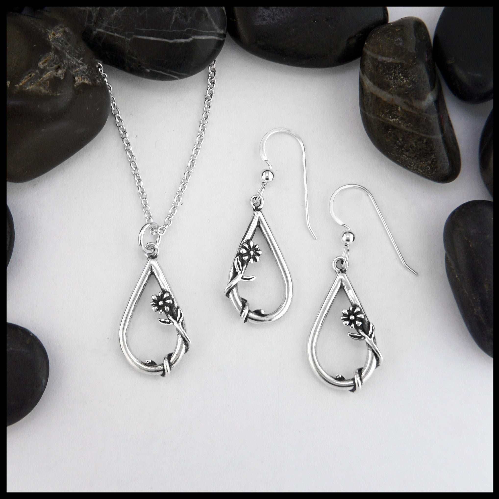 Sterling Silver teardrop frame pendant and earring set with whimsical vine and flower designs. Pendant comes with an 18" Sterling Silver Cable Chain.